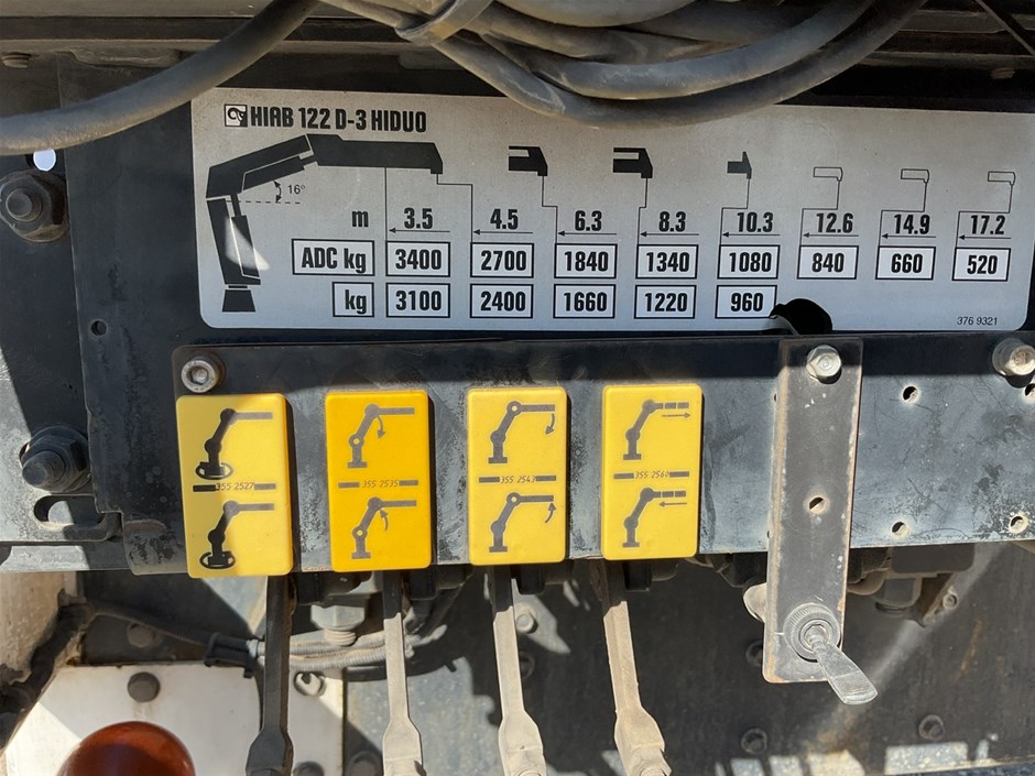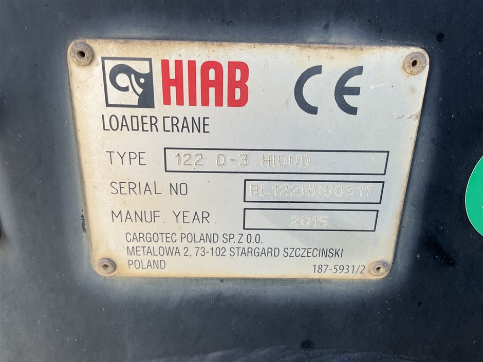 • Other Comments: Tray Dim 9200 x 2500 mm (w). 2015 Hiab 122 D3 Boom Crane . s/n BL122HD00311 .Capacity . 960 kg @10.3 m with Control and Books. Note Vendor advised crane operational.