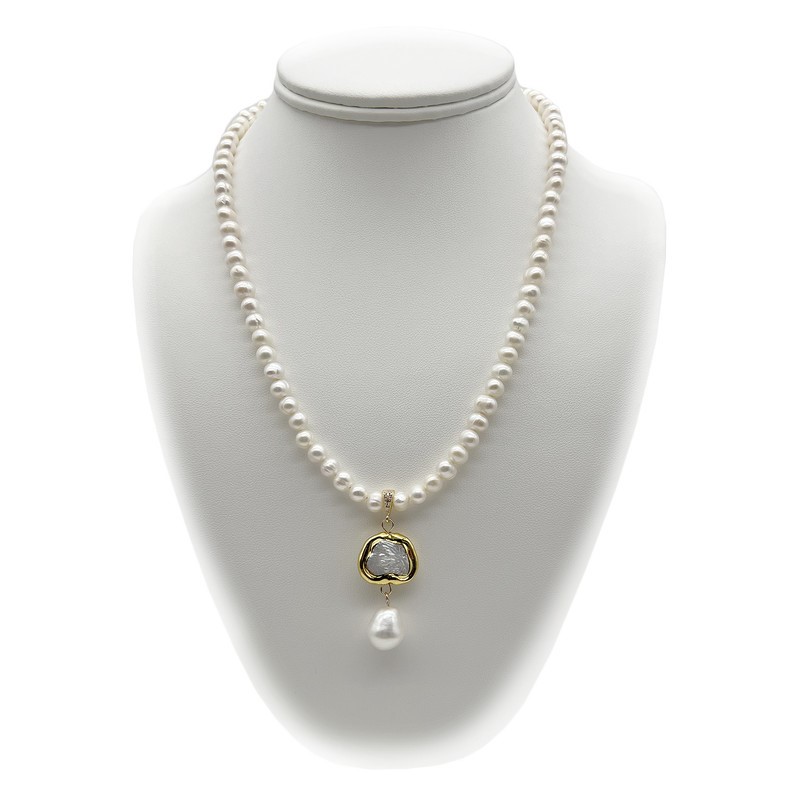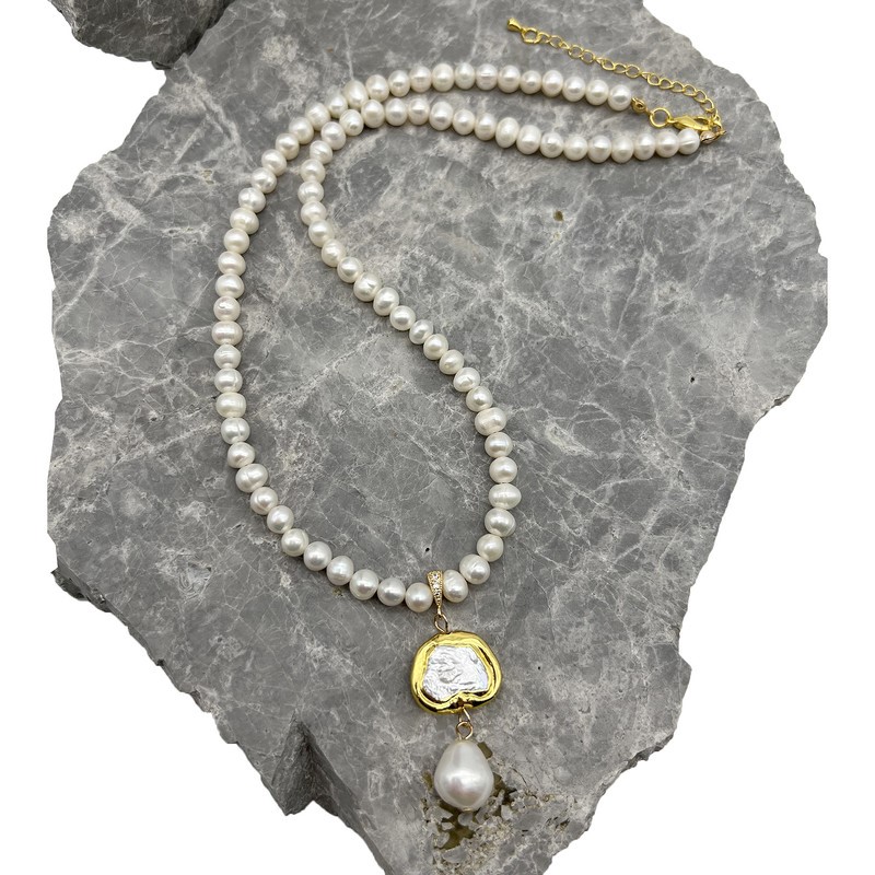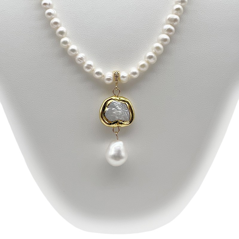 5-6mm White Freshwater, Keshi with Gold Trim & Baroque Pearl Pendant Charm Necklace.