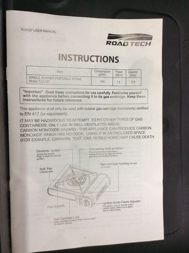 Road Tech TCA107 Portable Gas Cooker Stove New w/box
