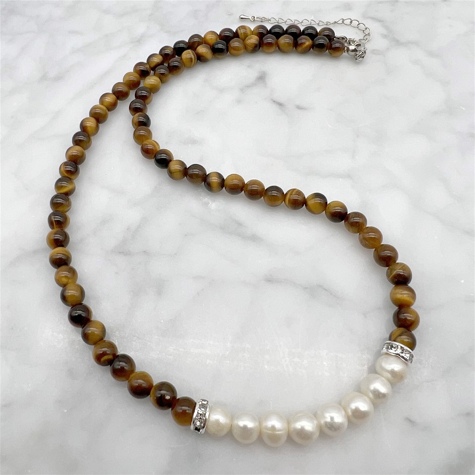 Natural 7-8mm Freshwater Pearl & Tiger Eye with Real Platinum Plated Necklace.