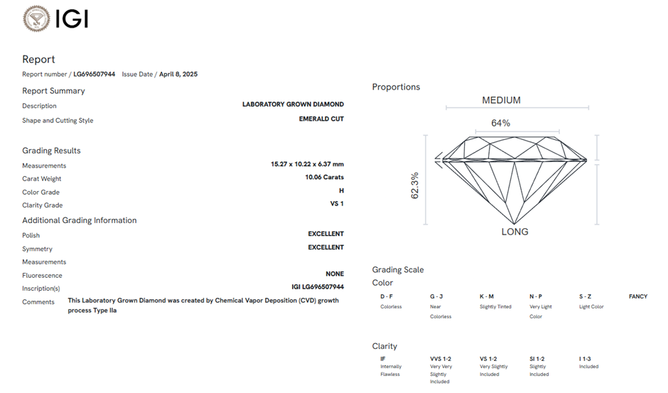10.06 Carats H/VS1 Lab Grown Diamond - IGI Certified