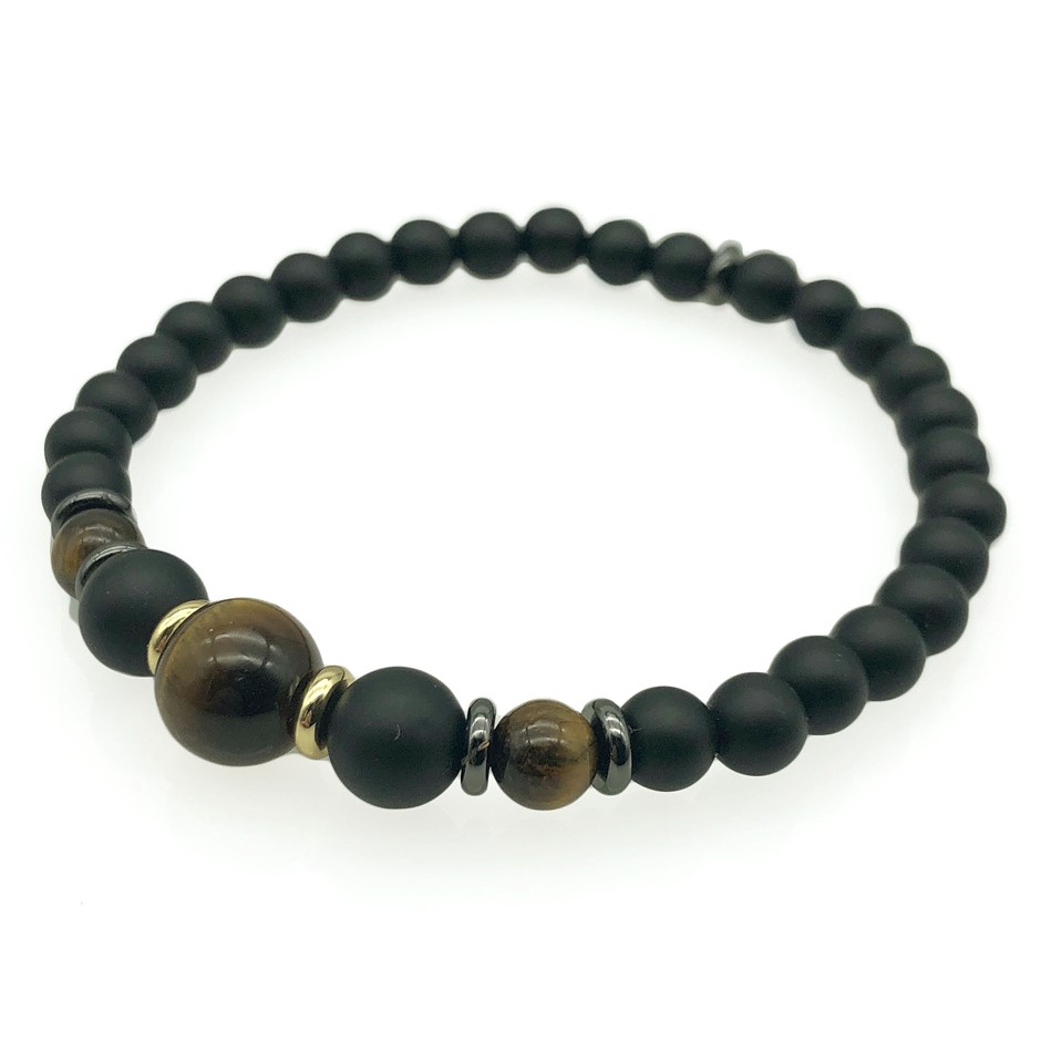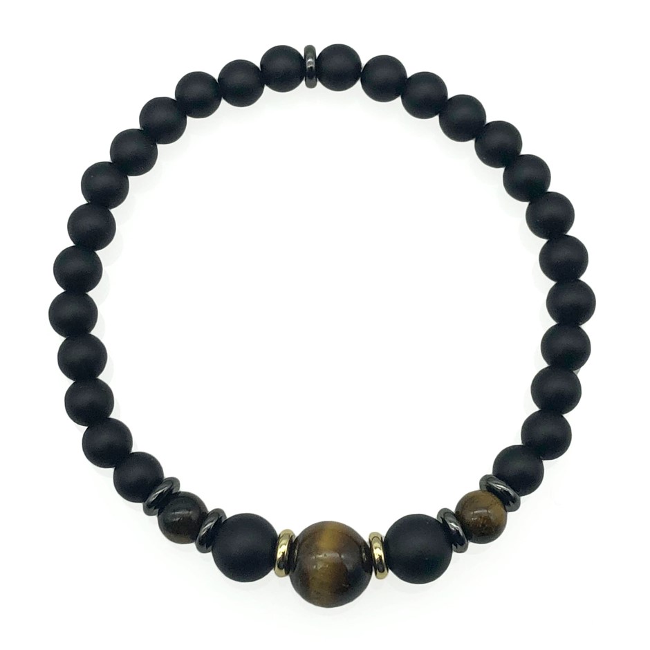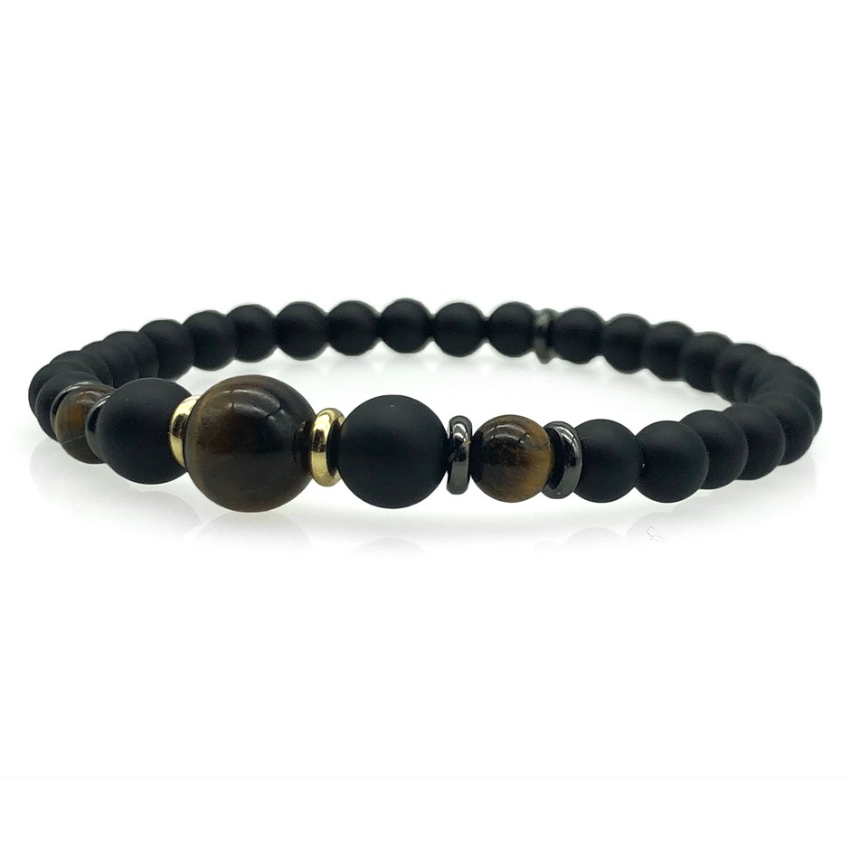 Men`s Strength Black Stone & Tiger Eye Stretch Beaded Bracelet.