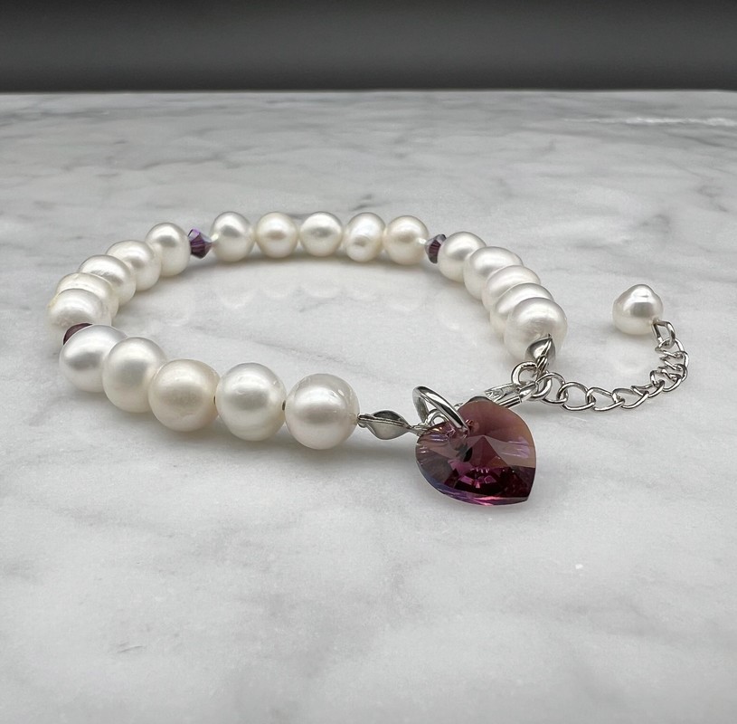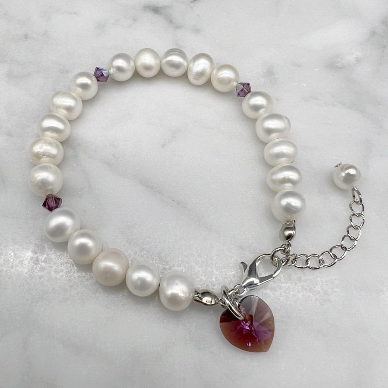 7-8mm Natural Potato & Baroque Freshwater Pearl with Swarovski® Heart Charm Bracelet.