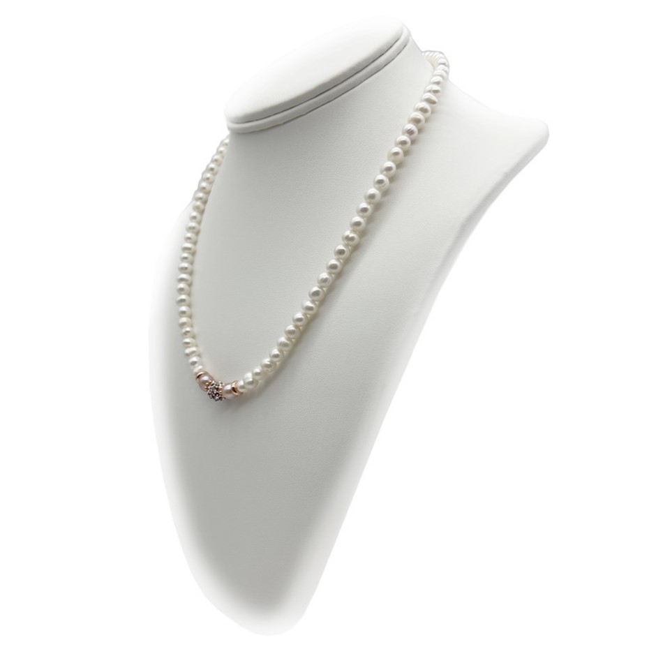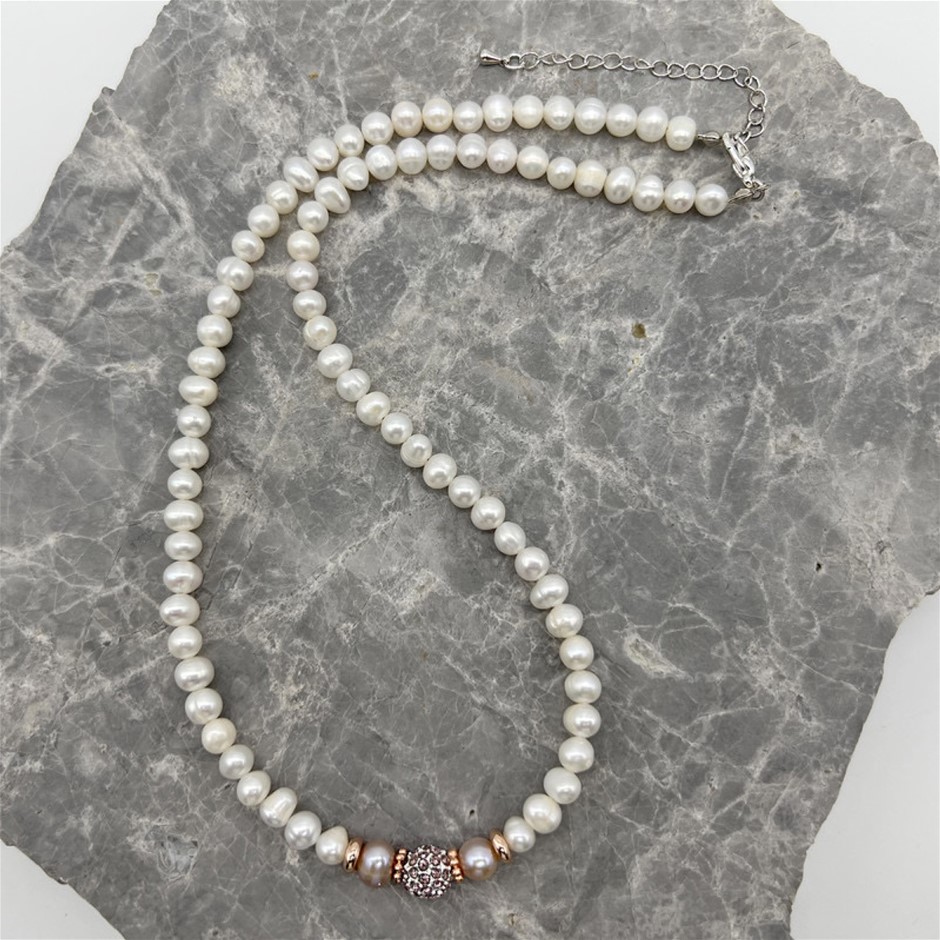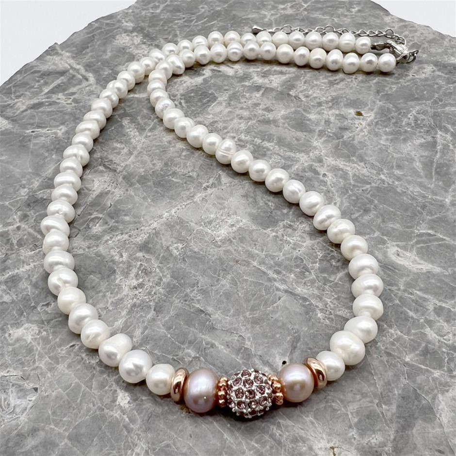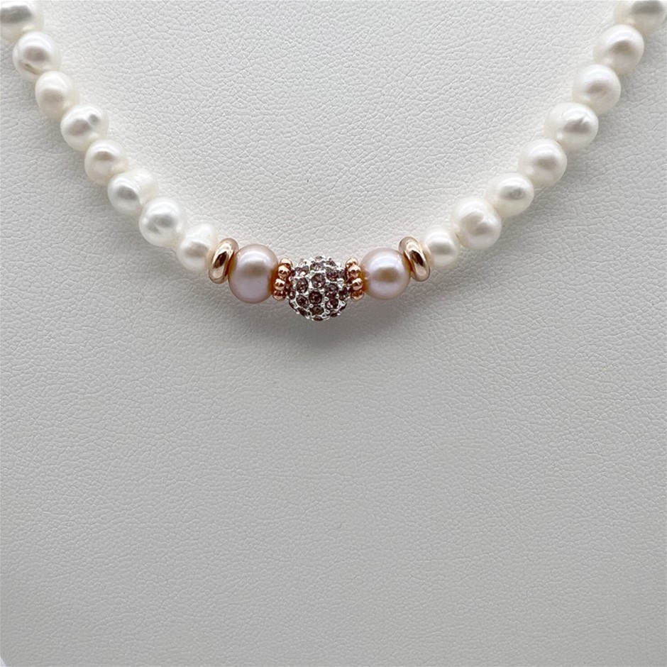 Natural 5-6mm White Freshwater Pearls with Pink Rhinestone Rose Gold Plated Necklace.