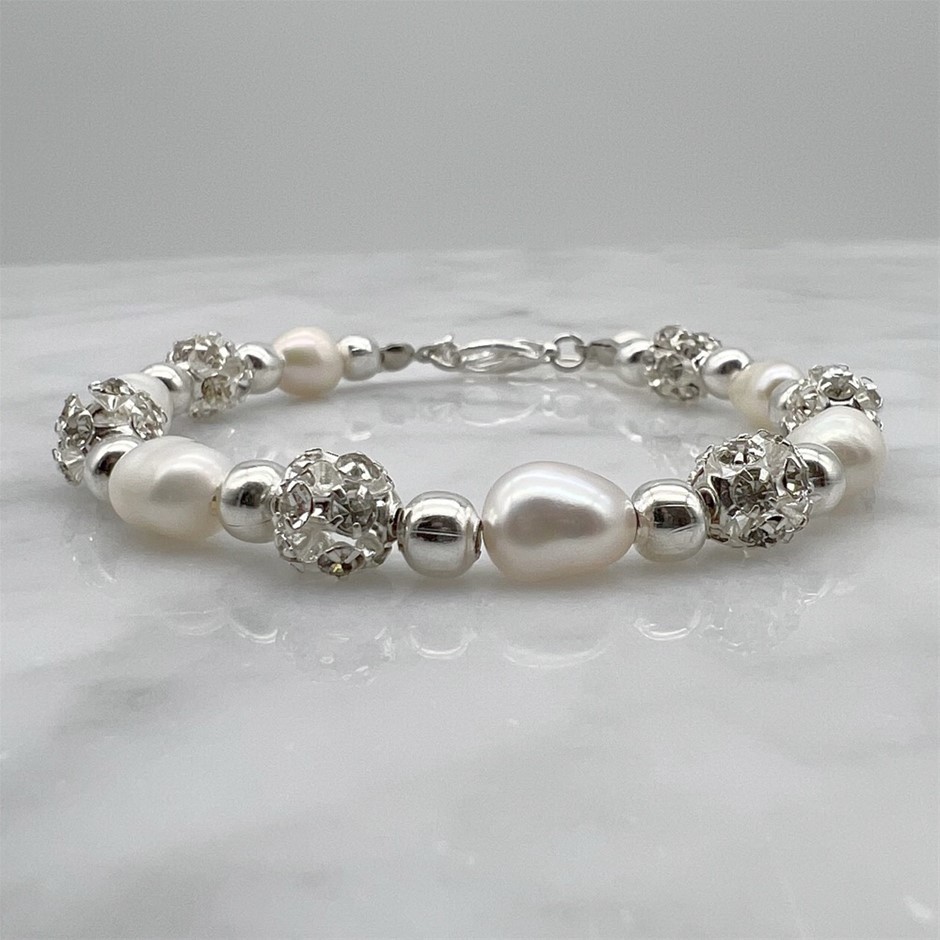 Rice Pearl & Rhinestone Silver Spacer Beads Bracelet.