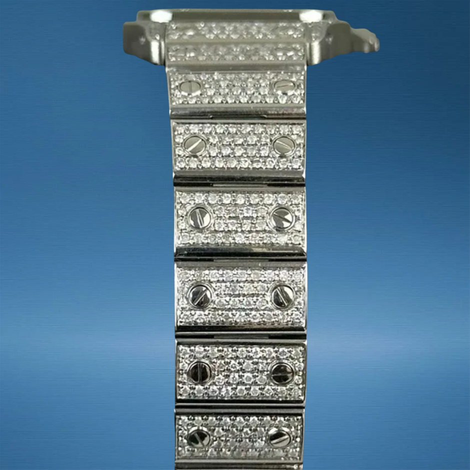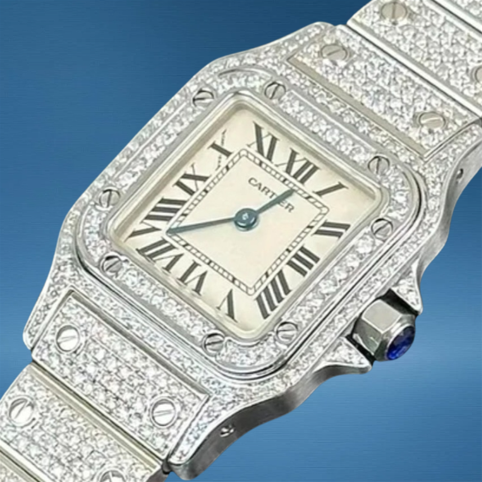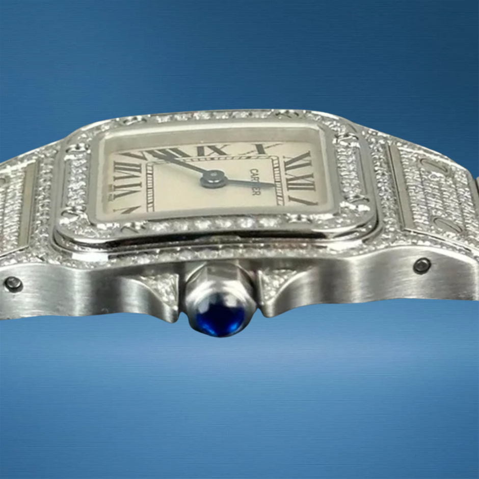 The Cartier Santos Galbée 1565 with custom diamond enhancements brings a classic Cartier silhouette to life with added luxurious sparkle, blending timeless squared-case design with bespoke gem-set refinement. Its elegant proportions and precise quartz movement make it a versatile choice for both everyday elegance and special occasions.