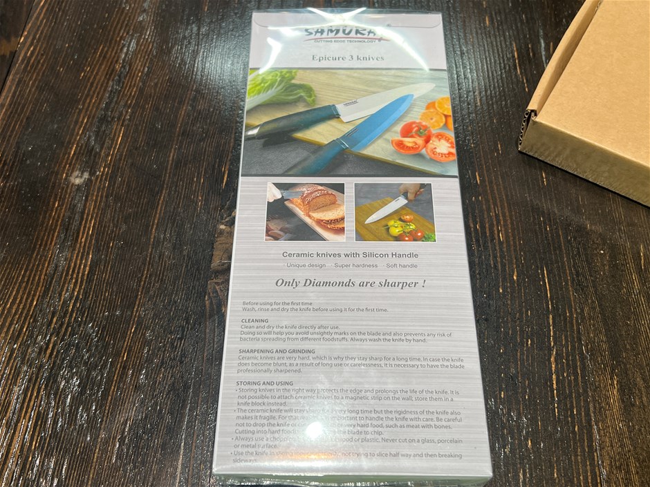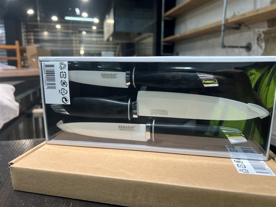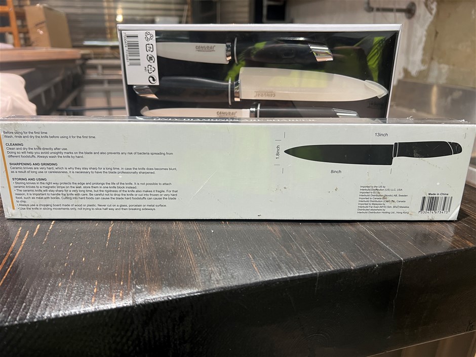 • Samurai Knife Set comprising 1x 8inch (20cm) Samurai Chef Knife Black 1x 3-piece knife set white. Ceramic Knives with Silicon Handles.