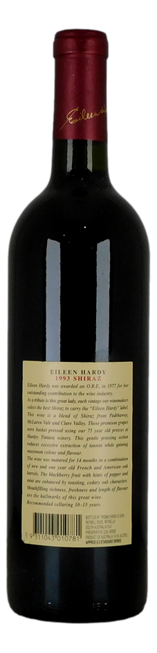 The *Hardys Eileen Hardy Shiraz 1993* shows rich, mature aromas of dark berries, chocolate, and spice, with hints of leather and tobacco. On the palate, it’s full-bodied and well-balanced, with concentrated flavors of blackberry, plum, and earthy notes. The tannins are soft and integrated, leading to a smooth, long finish. A refined and complex Shiraz that has aged beautifully.