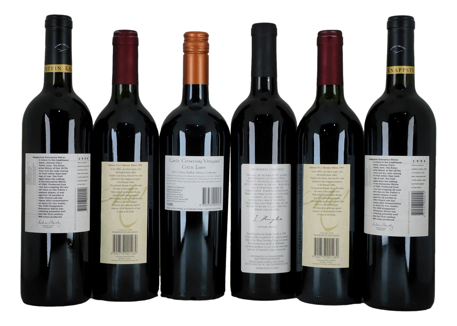 1x Gaelick Cemetery Shiraz Cabernet 20212x Saltram Barossa Shiraz 19941x Granit Hills 19912x Knappstein Enterprise Shiraz 1994