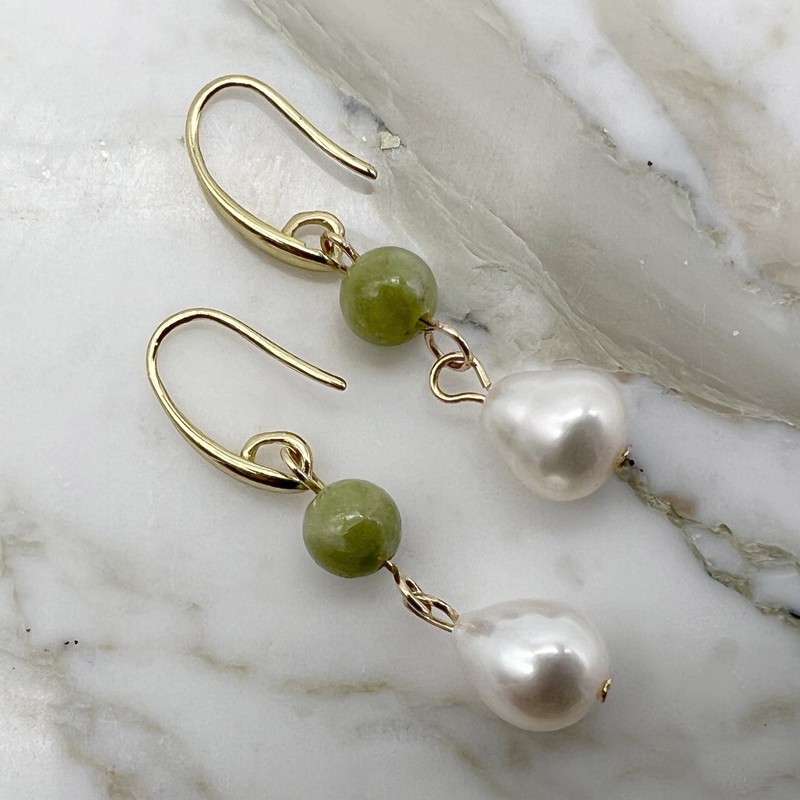 6mm Peridot & Baroque Pearl Dangling Earrings.