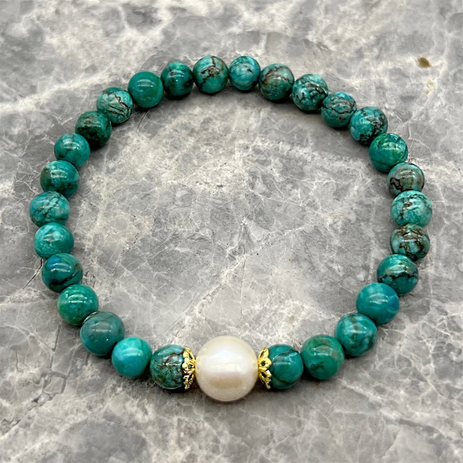 Natural 10mm White Freshwater Pearls with African Jasper `Turquoise` Gemstone Bracelet. Product Specifications: