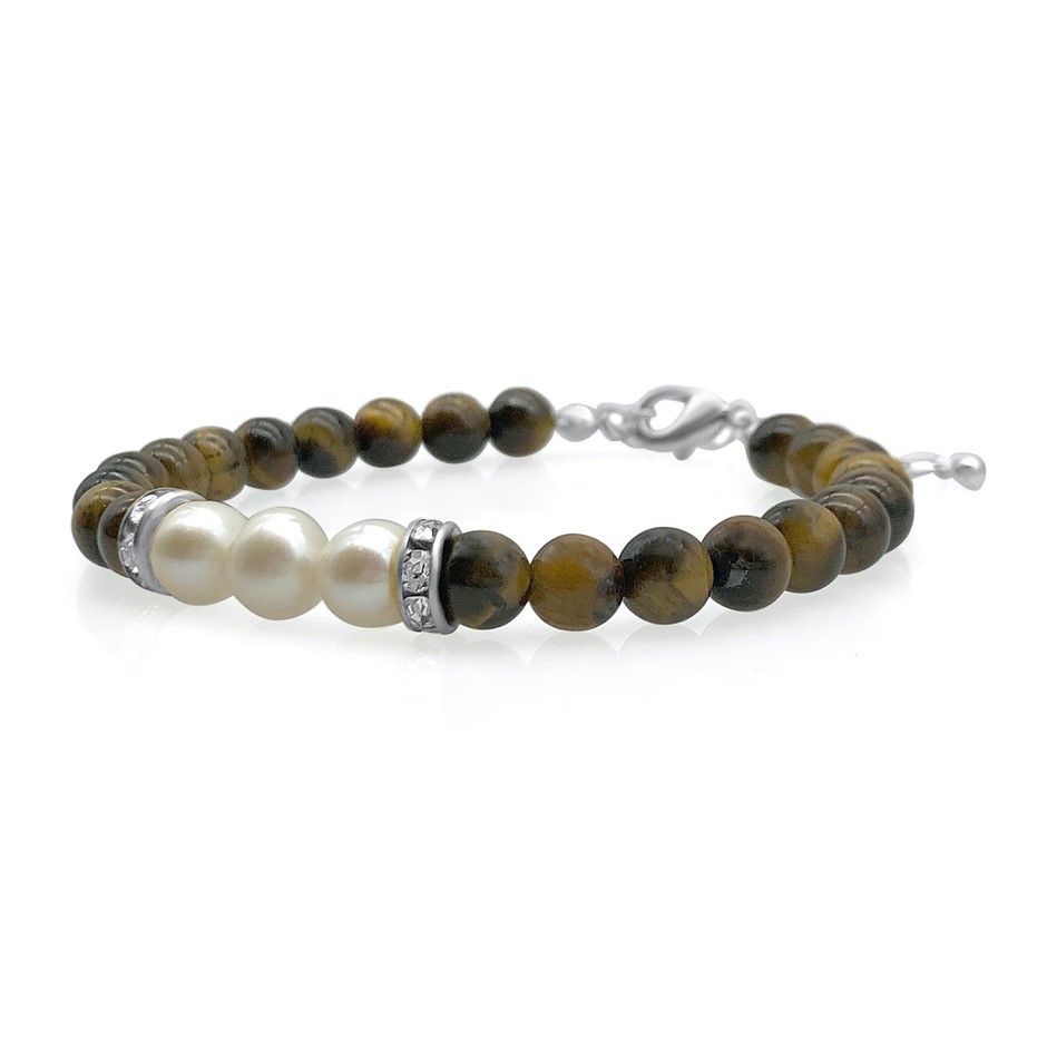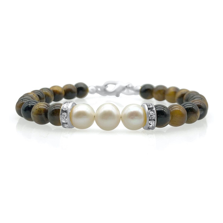 Natural 7-8mm Freshwater Pearl & Tiger Eye with Real Platinum Plated Bracelet.