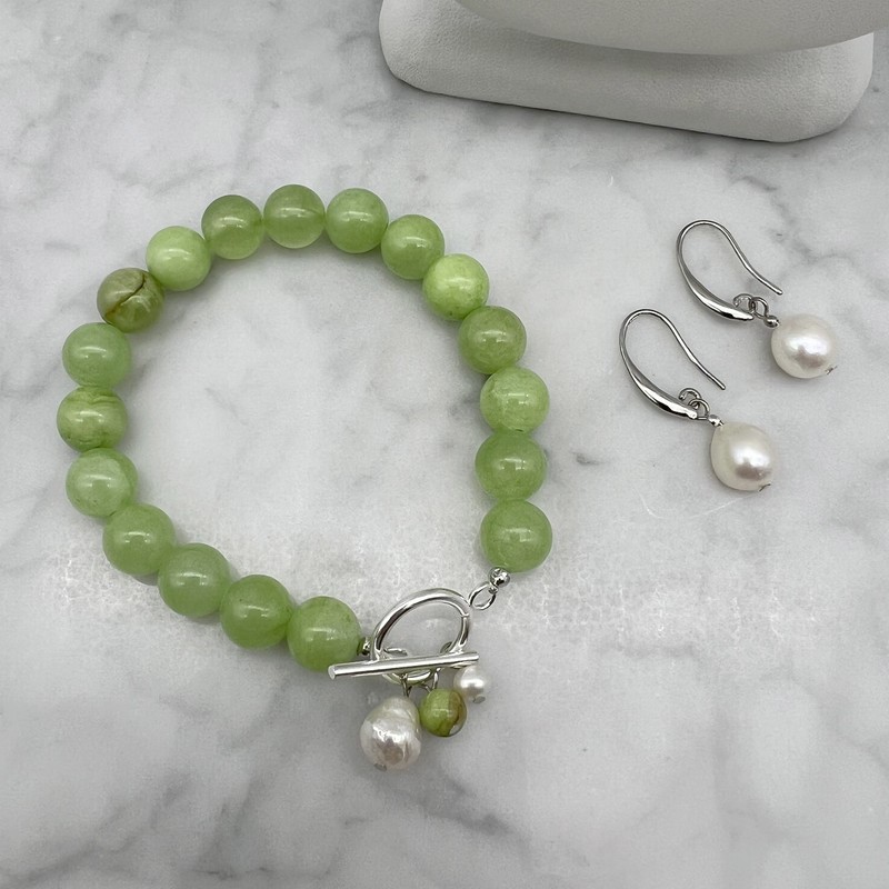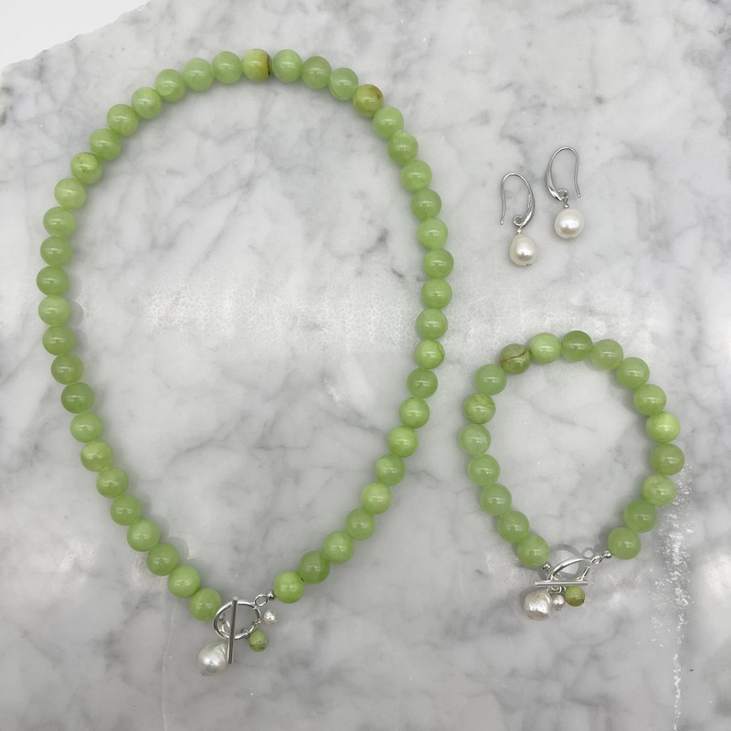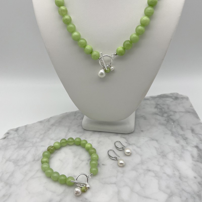 10mm Green Flower Jade with `O` Toggle Gemstone Beaded Necklace, Bracelet & Earring Jewellery Set