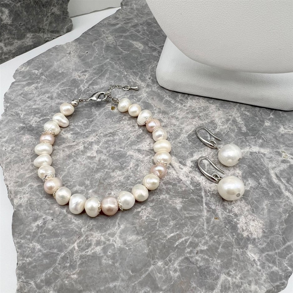 Natural Mix Shape 7- 8mm White & Pink Freshwater Pearls Platinum Plated Necklace, Bracelet & Earring Set