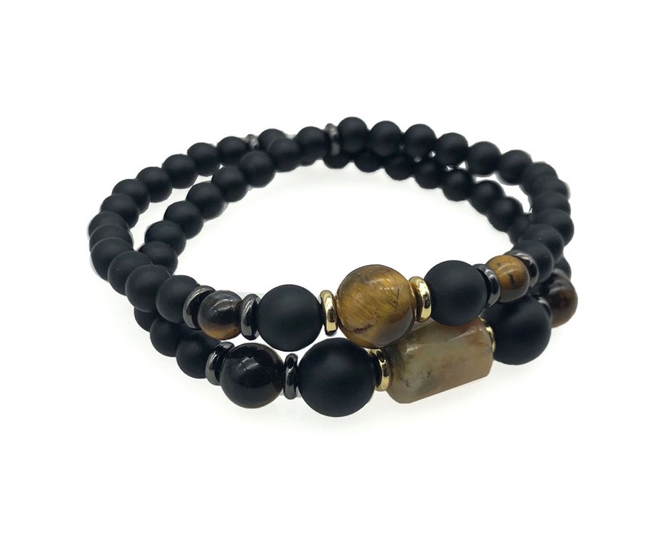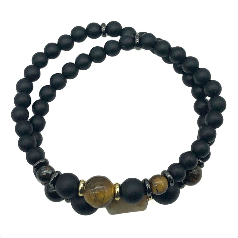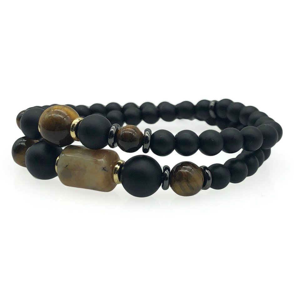 Men`s Black Stone, Tiger Eye & Agate 2 Row Stretch Beaded Bracelet.