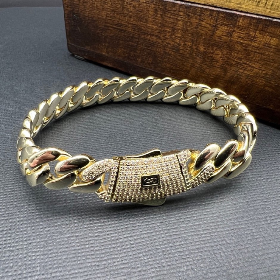 Opulent Galleria - 14K Gold-Filled Solid Cuban Bracelet, Simulated Diamonds,10MM Wide - 22.8cm