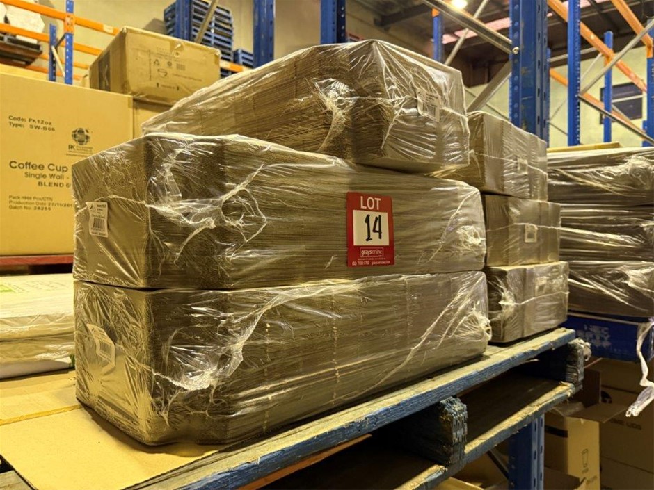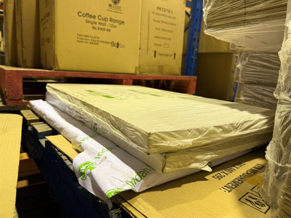 • A large mixed lot of food service packaging including pizza boxes, coffee cups and lids, takeaway food containers, food wrap and gloss sheets. Brands include Pinnacle, BBC Plastics, BellEco, Indah, and Green Label Foodwrap. Products include: