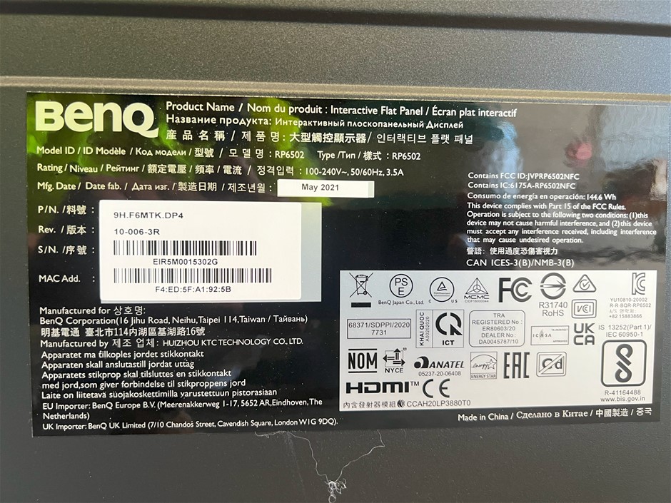 Benq Flat RP6502 Screen with Benq 4k Web Cam