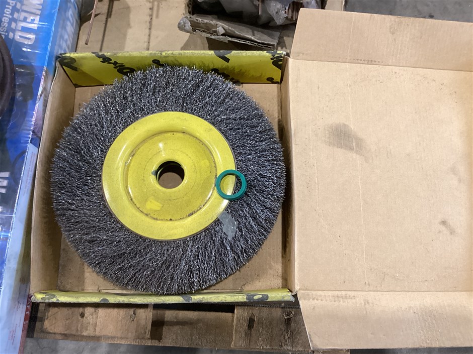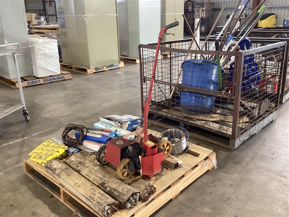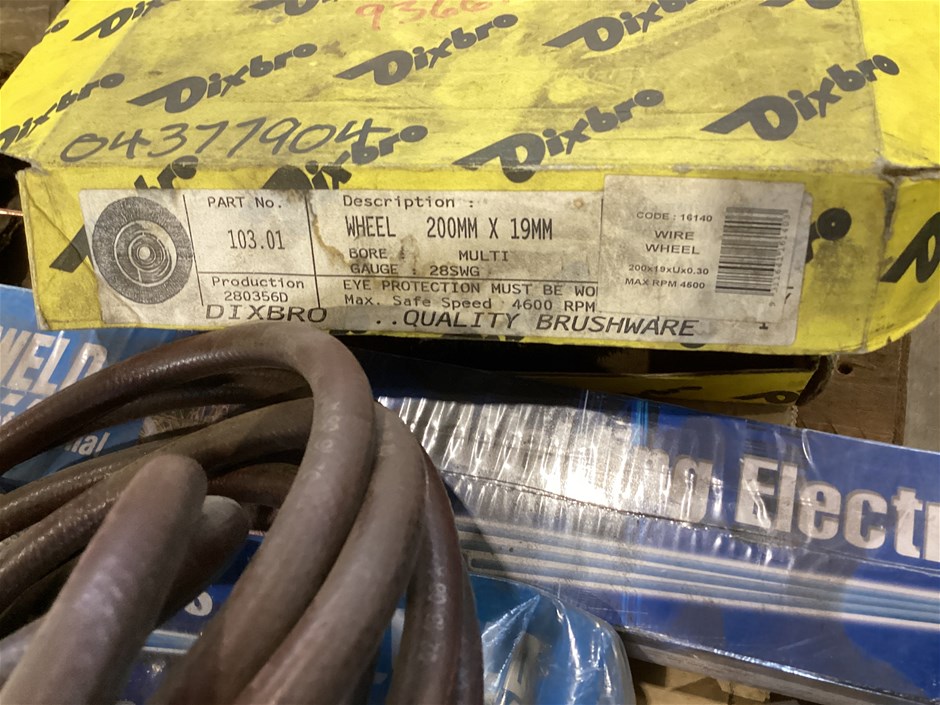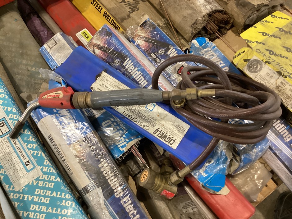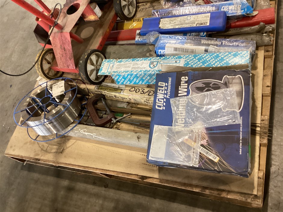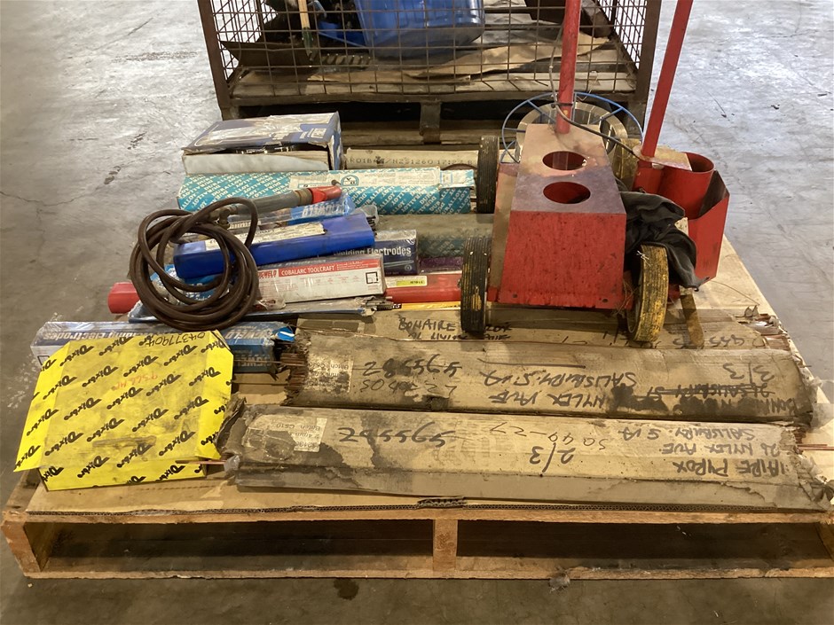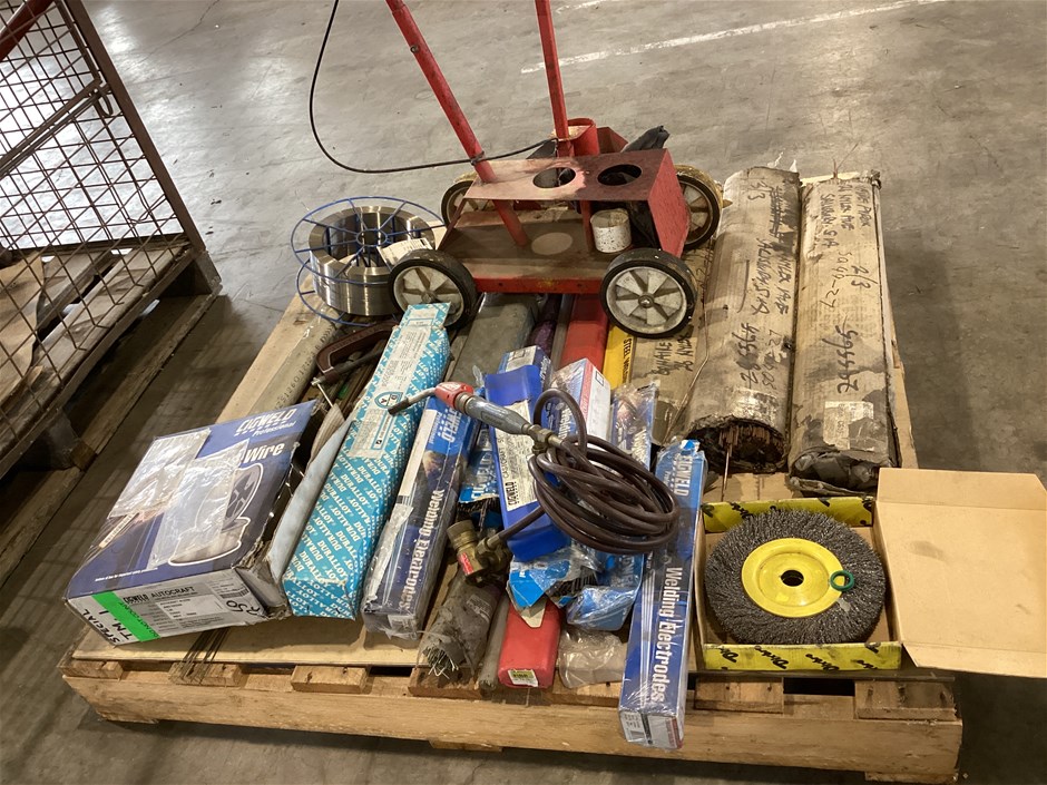 • Welding Electrodes, Mig Wire, Oxy Welding Filler Rods And More, various types and sizes of arc welding electrodes, various types and sizes of oxy welding filler rods, 2 x spools of MIG wire spools, turbo torch -extremely welding gun, manual wheeled line marker, wire wheel, UNTESTED UNITS