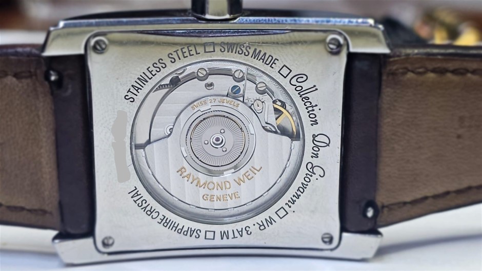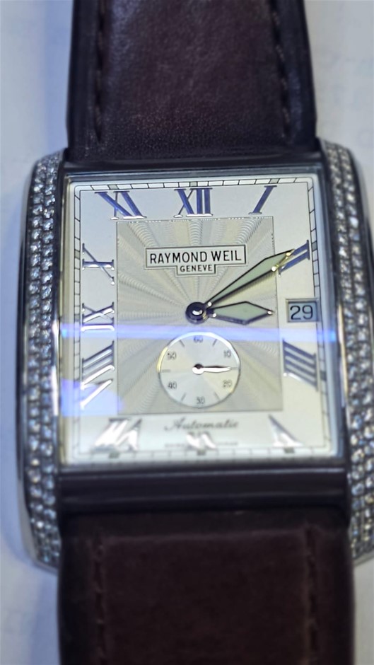 Brand Name:Raymond Weil Style Number: 2875 Series:Don Giovanni Style (Gender):Men`s Case Material:Stainless Steel - Diamond Dial Color:Silver with Guilloche Movement:Automatic Functions:Hours, Minutes, Small Seconds, Date Crystal Material:Sapphire - Scratch Resistant Case Length:38.0 mm Case Width:34.0 mm Case Thickness:11.0 mm Caseback:Sapphire Crystal Display Back with `Collection Don Giovanni, WR 3ATM, Stainless Steel, Swiss Made` Bezel Material:Stainless Steel Bezel Function:Fixed Water Resistance:30m / 100ft (unsuitable for prolonged contact with water e.g. swimming, bathing) Crown Material:Stainless steel Calendar:Automatic Date at 3 o`clock Watch Bracelet / Strap Material:Leather - Brown Watch Clasp Material:Stainless Steel Tang-Buckle Max Wrist Size:7.75 Watch Strap Width:21.0 - 28.0 mm (SN:2875-V215091) (311355-28)