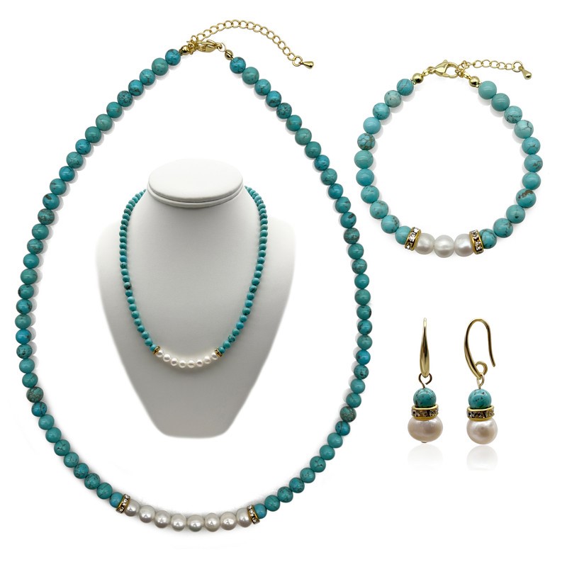 Natural 7-8mm Freshwater Pearl & Turquoise with Real 18k Gold Plated Necklace, Bracelet & Earring Set