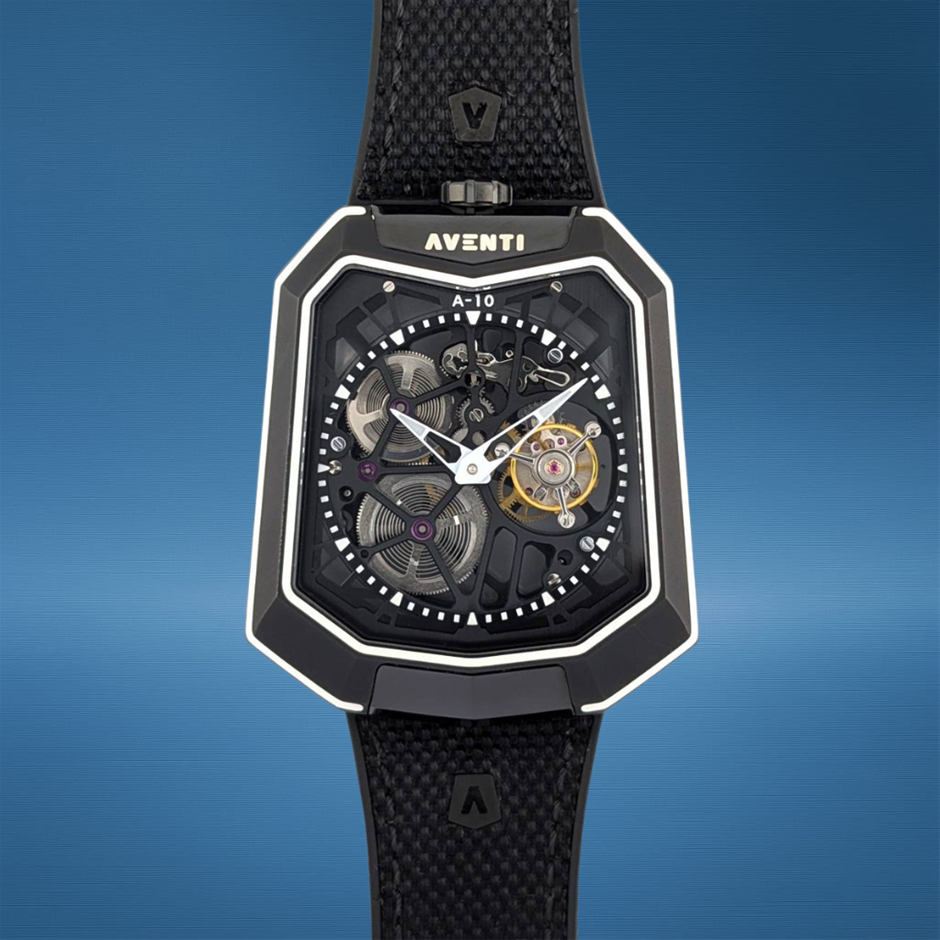 Bold, futuristic, and unmistakably modern, the Aventi A10 DLC Black stands out with its aggressive geometry and full black diamond-like carbon (DLC) coated titanium case. This tonneau-shaped watch features a skeletonised dial and high-performance movement, delivering a luxury design-forward experience unlike any other.