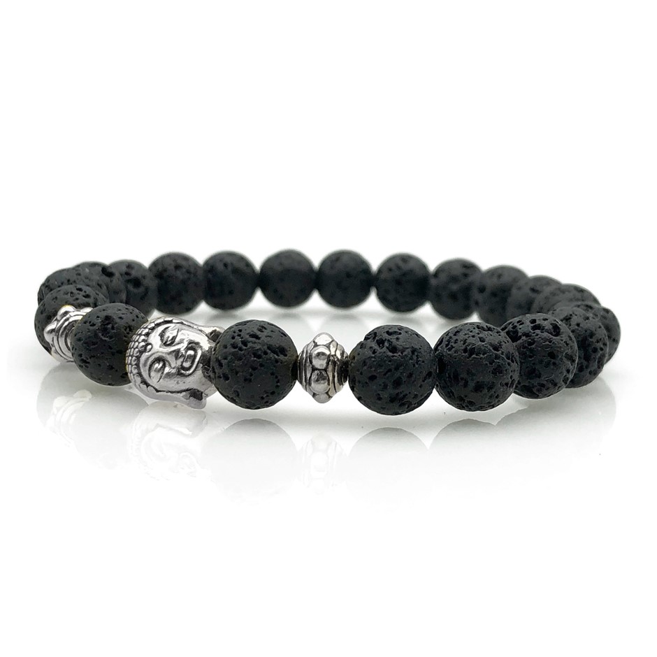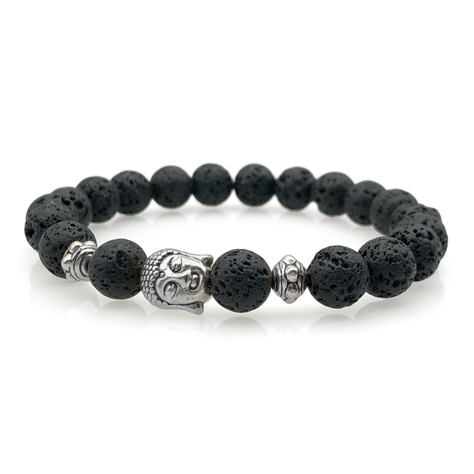 8mm Lava & Antique Silver Buddha Chakra Healing Charm Beaded Stretch Bracelet.