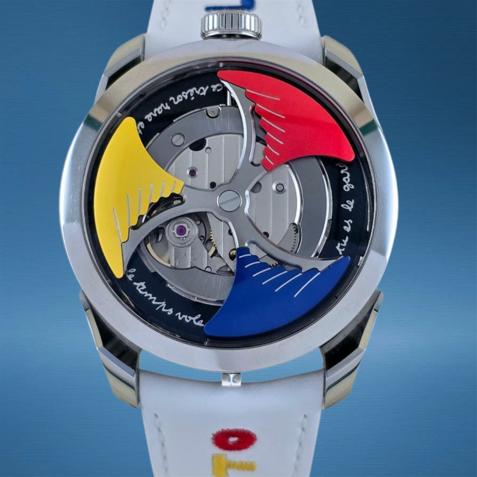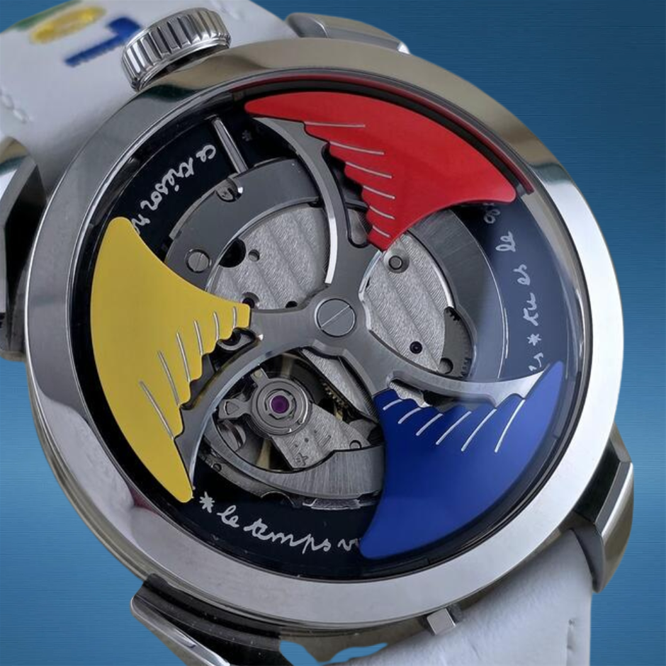 The M.A.D.1 Time to Love is a striking contemporary timepiece from MAD Editions, designed to challenge traditional horological aesthetics with bold personality and modern flair. Featuring a large 42mm case, this model makes an immediate visual impact while embracing unconventional design cues that distinguish it from classic watches. The “Time to Love” theme adds playful character and artistic expression, appealing to collectors who value individuality and creative watch design. Built with modern materials and finishing, it balances avant-garde styling with everyday wearability.