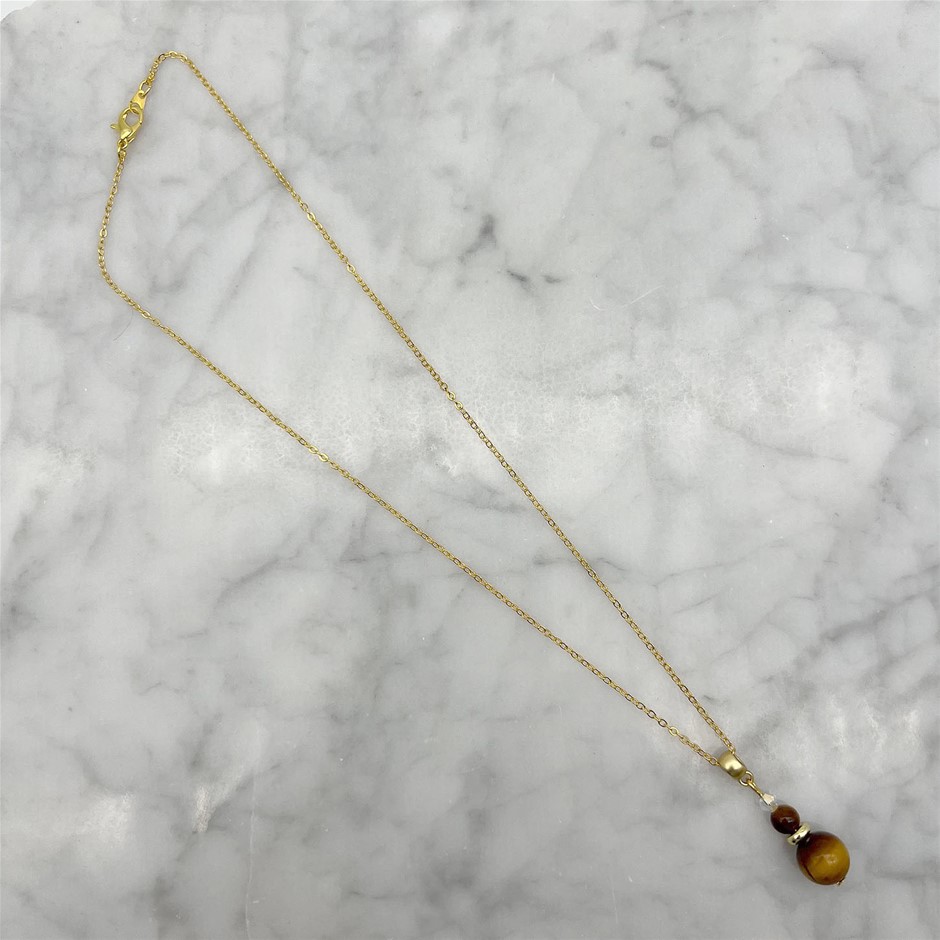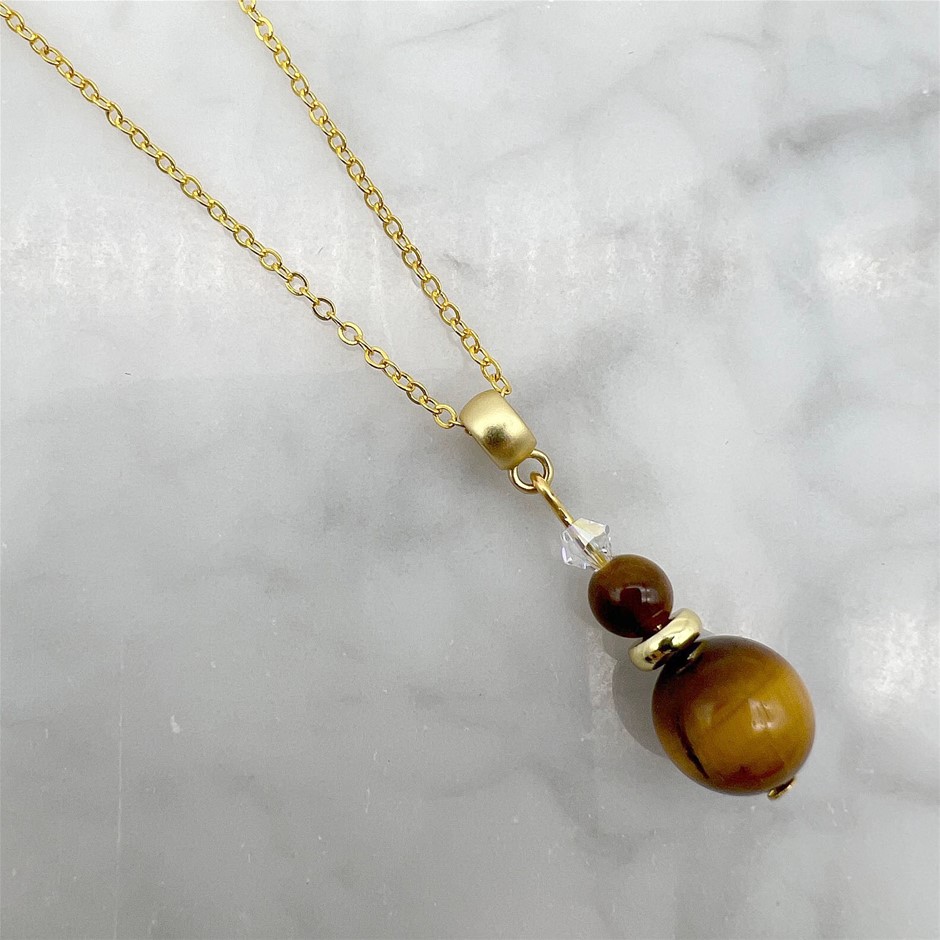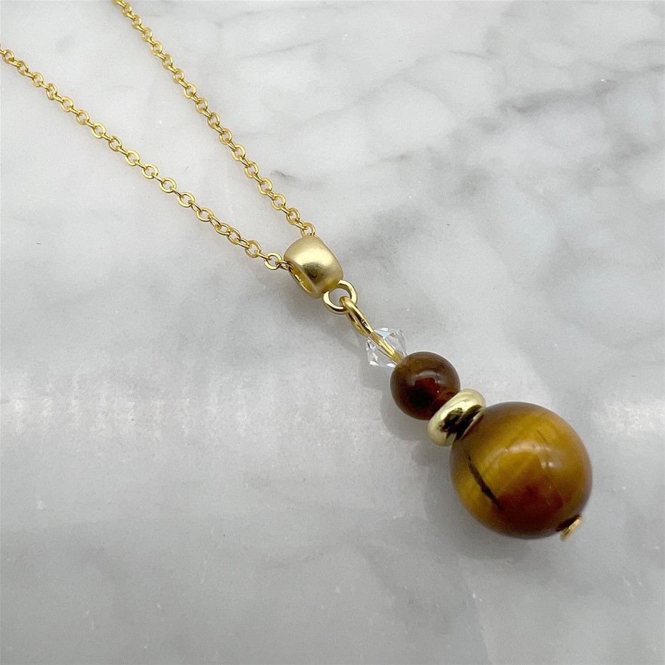 Genuine Tiger Eye & Swarovski® Austrian Crystal Gold Plated Pendant Necklace