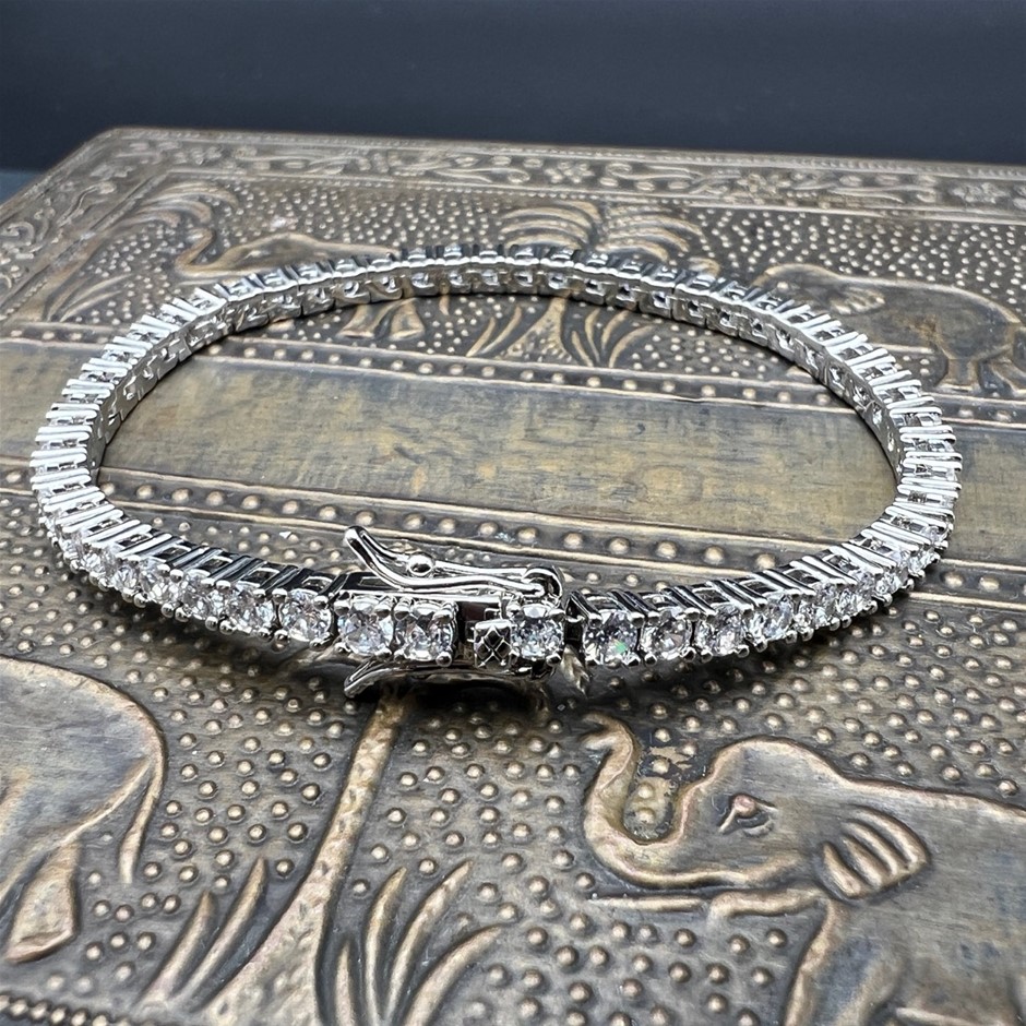 Opulent Galleria - 18k White Gold-Filled Tennis Bracelet with Round Facet Cut Simulated Diamonds – 17.8cm