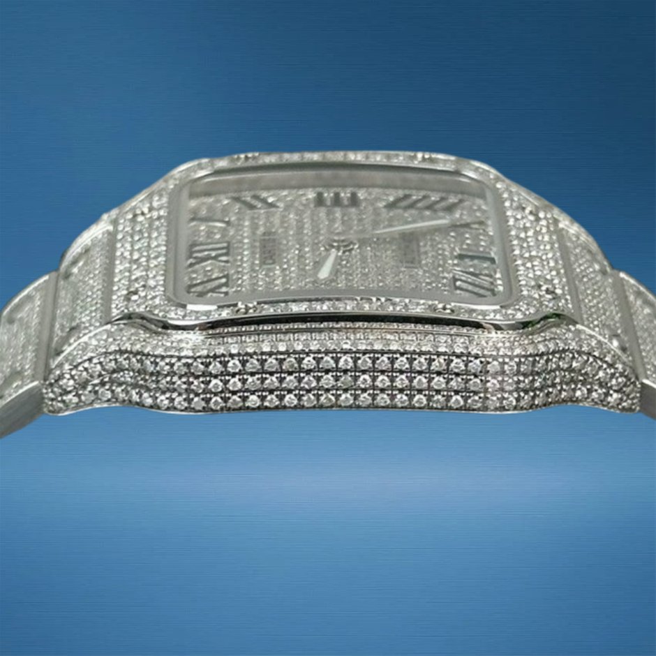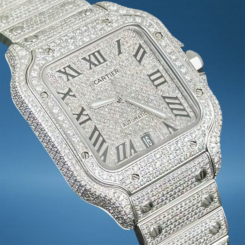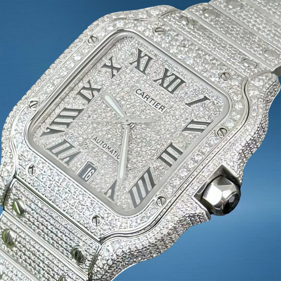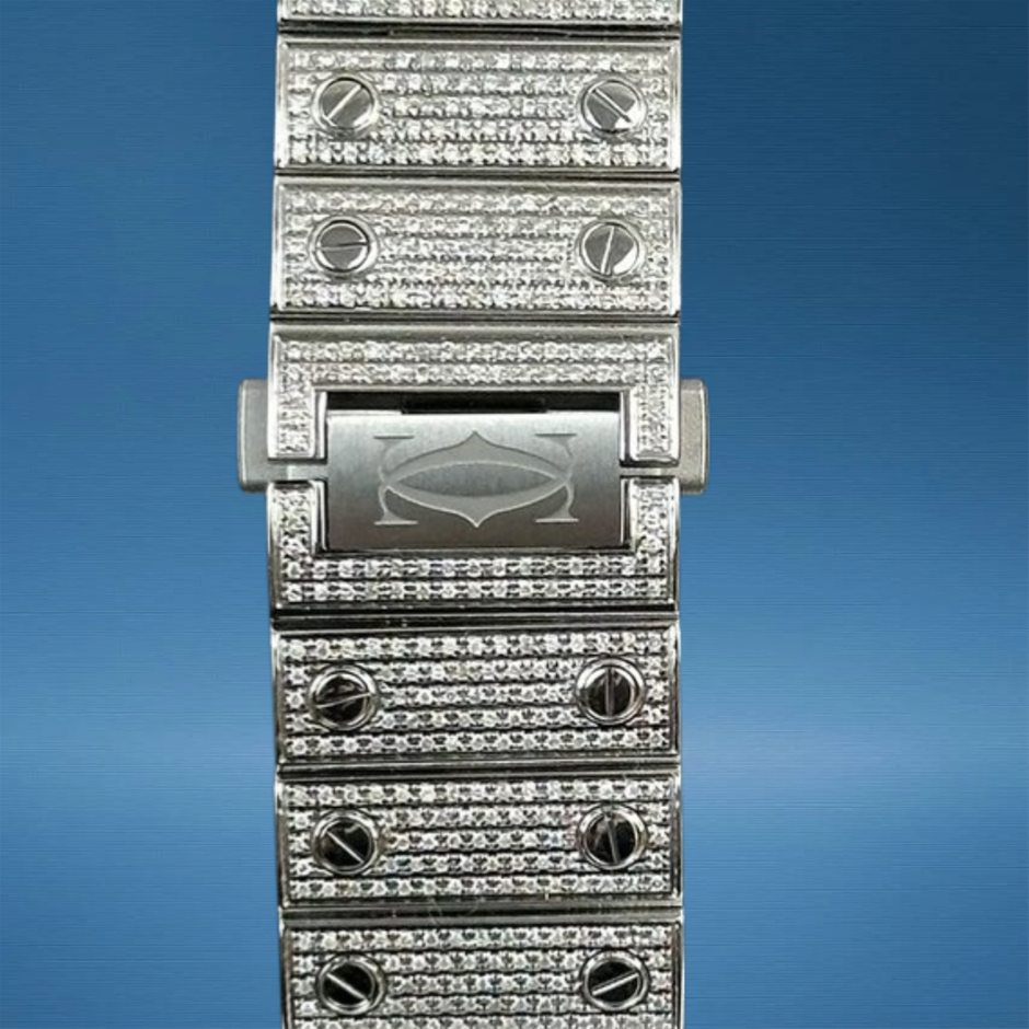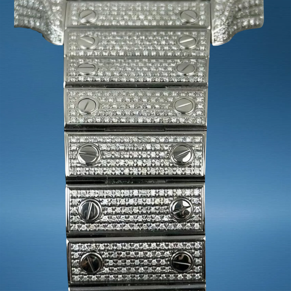 The Cartier Santos de Cartier Large WSSA0037 with custom diamond enhancements amplifies the classic Santos design with striking gem sparkle, blending timeless Cartier elegance with modern luxury finishing. Its 38.8 mm profile and iconic squared silhouette make it a versatile standout for both everyday and special-occasion wear.