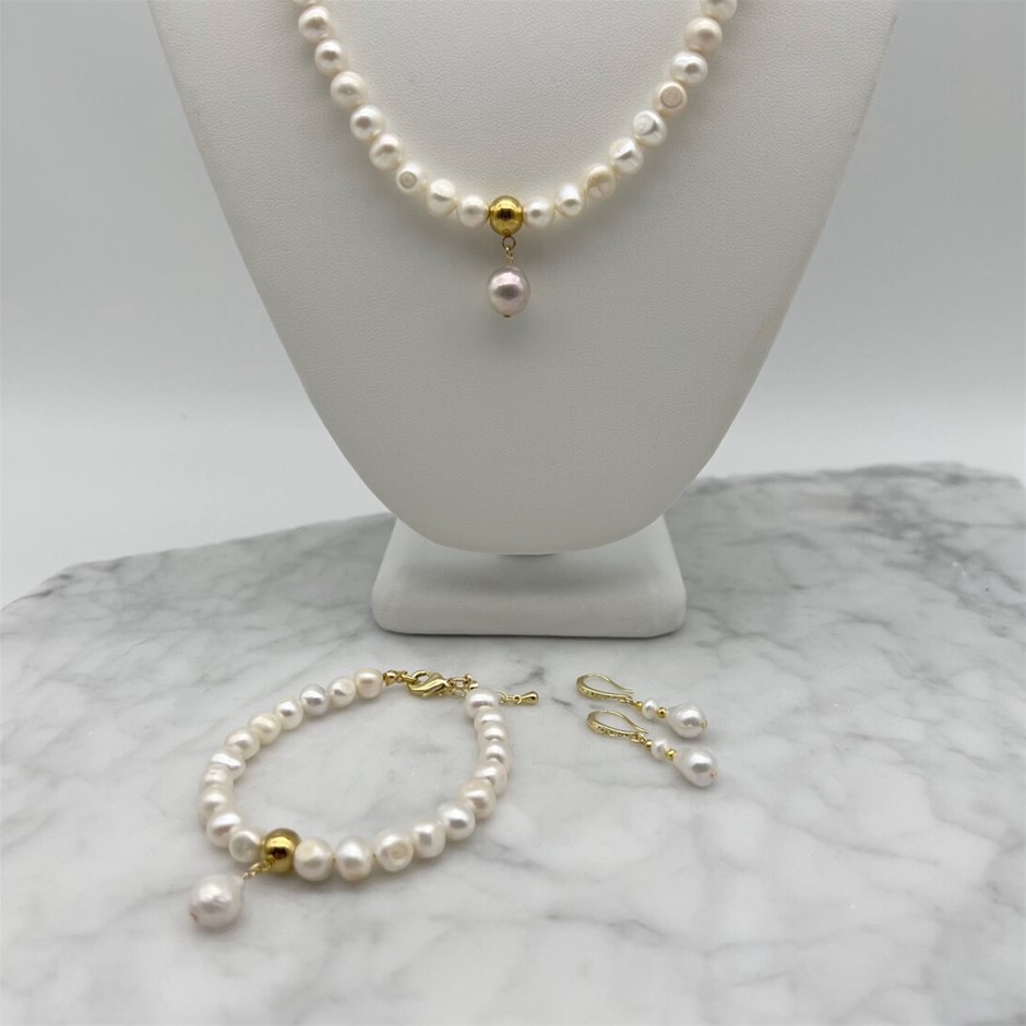 Elegant Sea White Mixed Shape Freshwater Pearls & Baroque Pendant Necklace, Bracelet & Earring Set