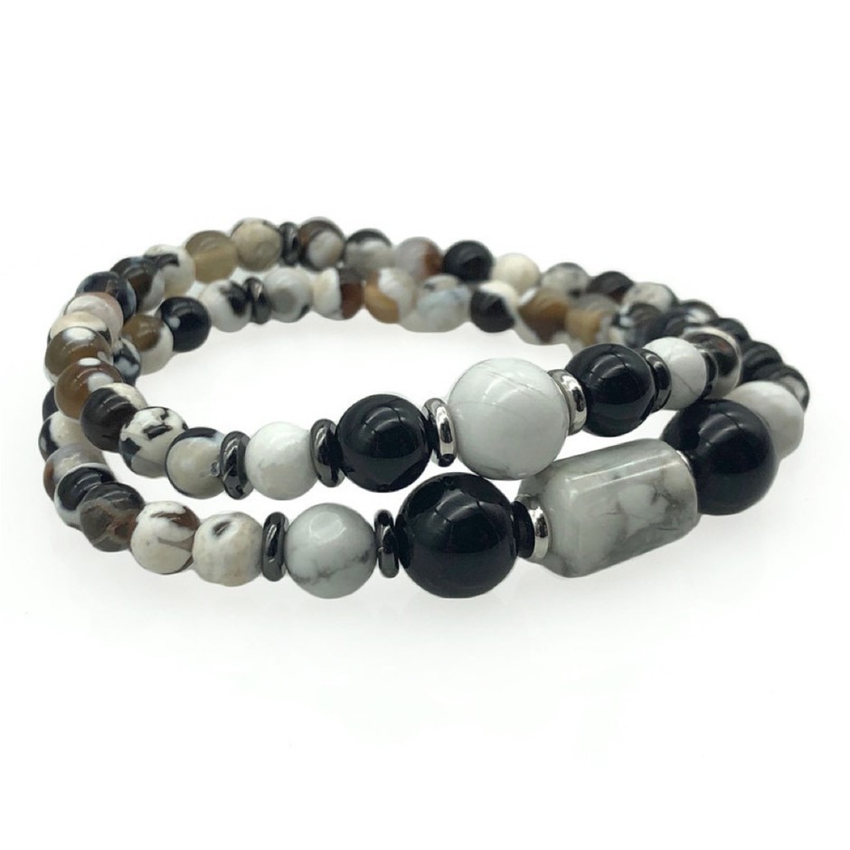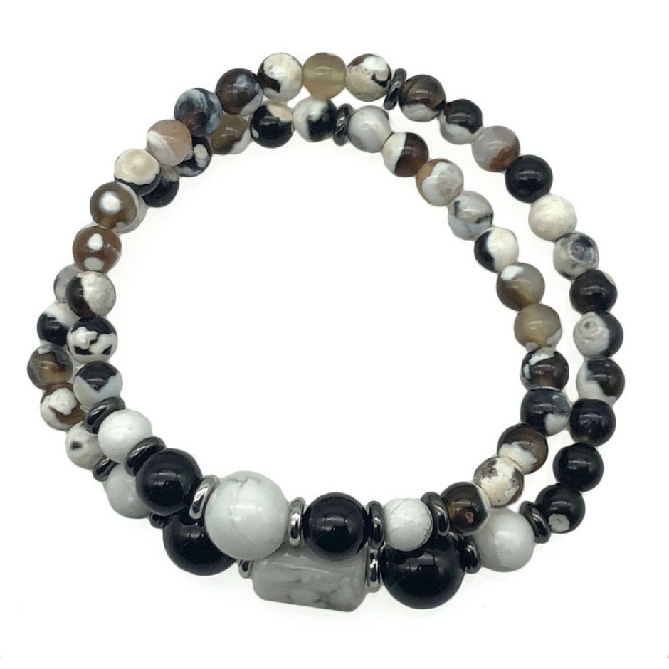 Men's Fire Agate, Black Agate & Howlite 2 Row Beaded Bracelet