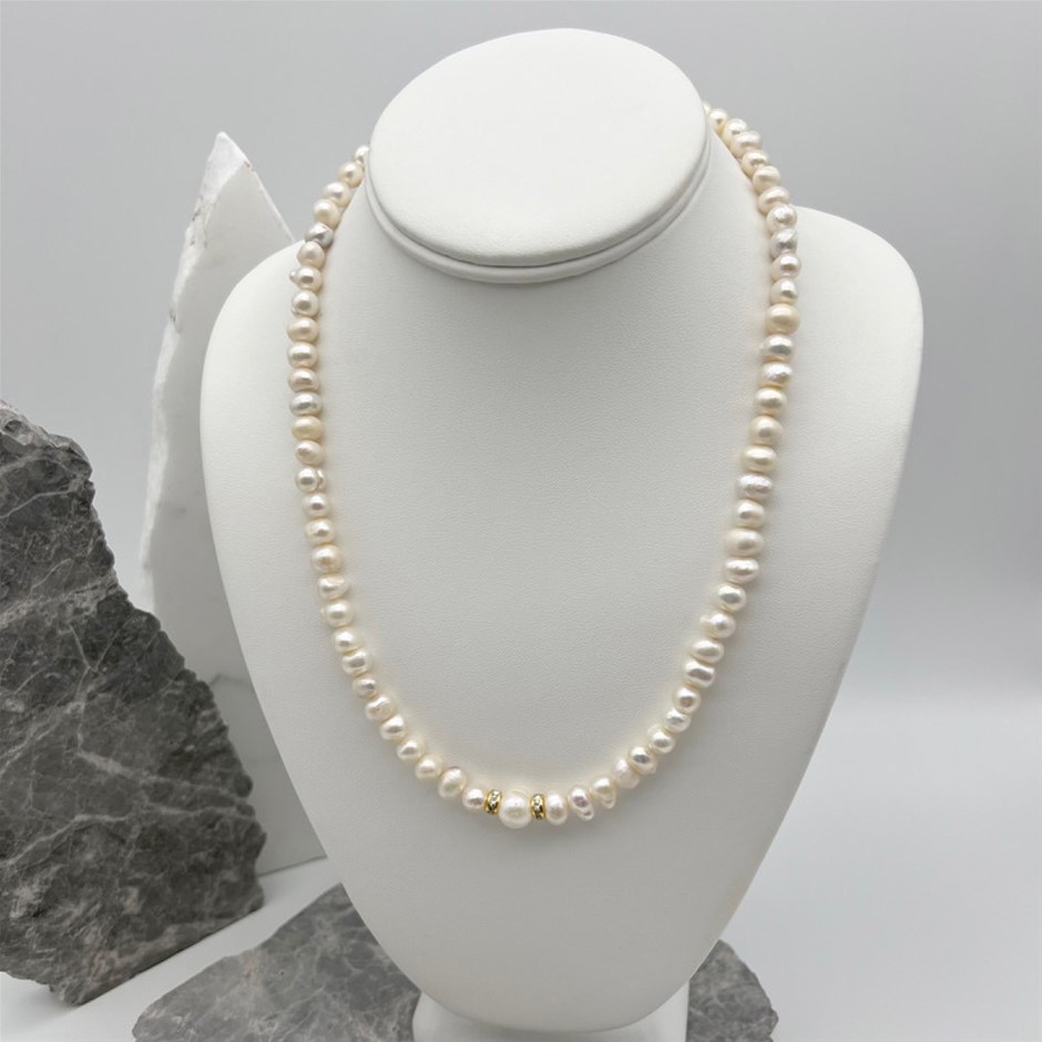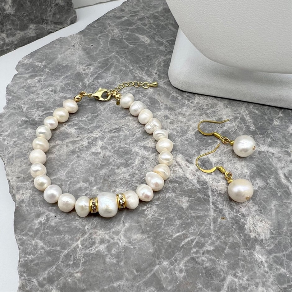 Natural Mix Shape - Large Central White Freshwater Pearl & Rhinestone 18k Gold Plated Necklace, Bracelet & Earring Set