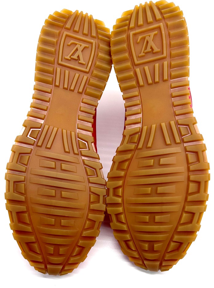 men`s size 8.5, top lace up with gold tone LV charm, red calf leather, Lous Vuitton & Supreme embossed on back, rubber sole, made in Italy, UNWORN, dust covers, extra laces, papers & original box. This item has been professionally verified as a genuine product and comes with accompanying 3rd party Certificate of Authenticity (305188-77)