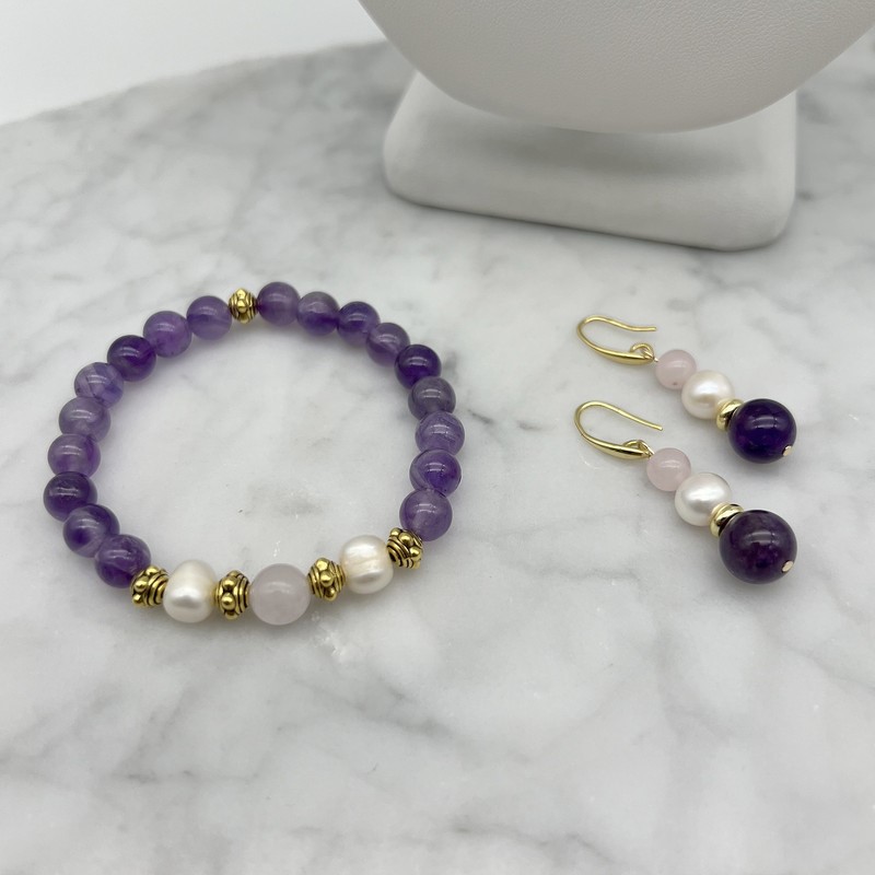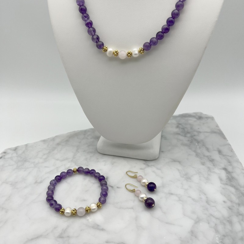 Natural Amethyst, Rose Quartz, Freshwater Pearls & Antique Gold Spacers Beaded Necklace, Bracelet & Earring Set