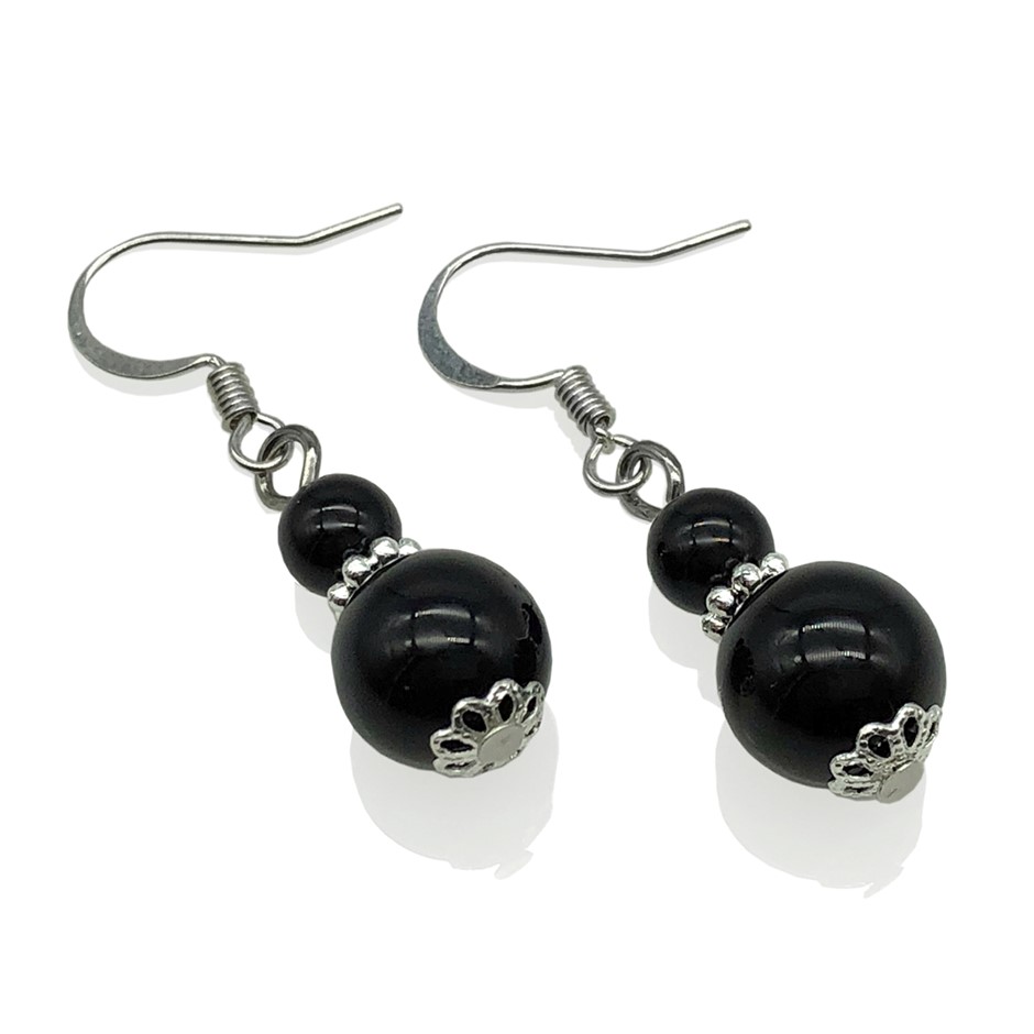 6-10mm Natural Round Black Agate Silver Plated Drop Earrings.