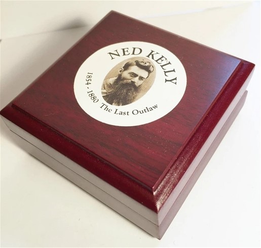 • New ``Ned Kelly #1`` 1/10th oz HGE 999 Gold Australiana Coin Presented in an Awesome Wood Display Box, Last Stand