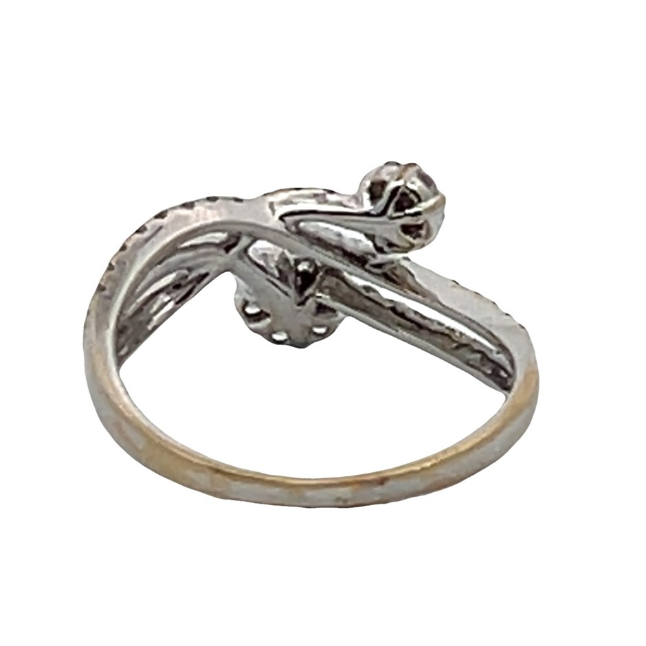 • 14 round brilliant cut diamonds claw & rub-over set in 2 clusters with 48 round brilliant diamonds grain set in split cross over design, stamp 18k, ring weight 3.2 grams.
