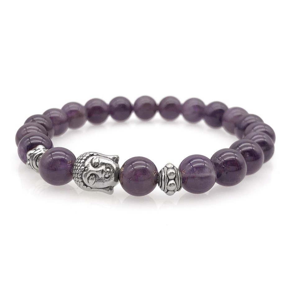8mm Amethyst & Antique Silver Buddha Chakra Healing Charm Beaded Stretch Bracelet.