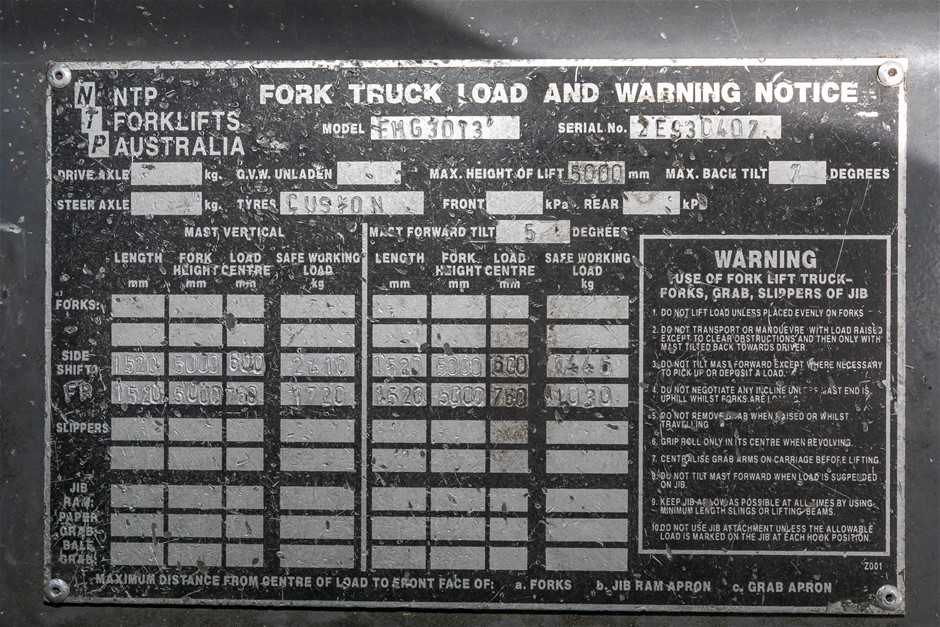 Disclaimer: Forklift Note - GraysOnline does not warrant information on compliance plates or information not available in the event of a compliance plate not fitted – this unit should be tested and certified as by legislation prior to use.