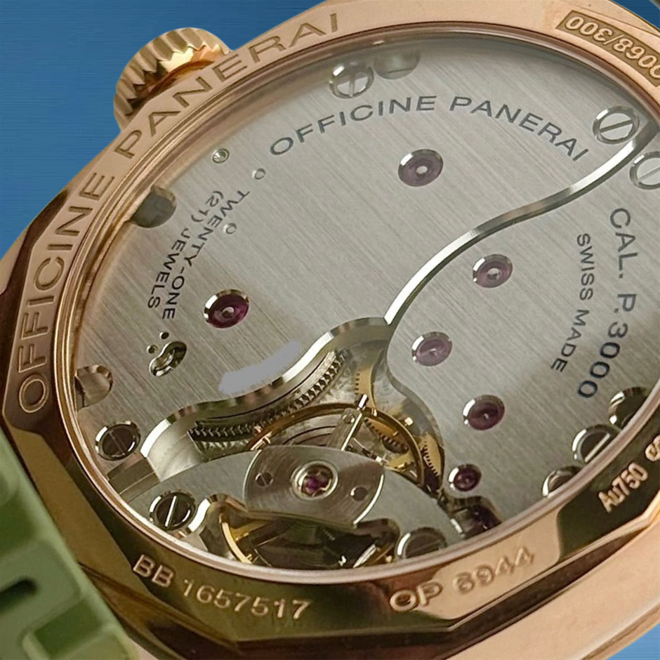The Radiomir 1940 PAM 00515 combines Panerai’s historic military-inspired design with a luxurious 18K rose gold case and striking green dial, creating a distinctive wrist presence. Its generous 47 mm dimensions and hand-wound movement reflect the brand’s heritage and tool-watch roots.
