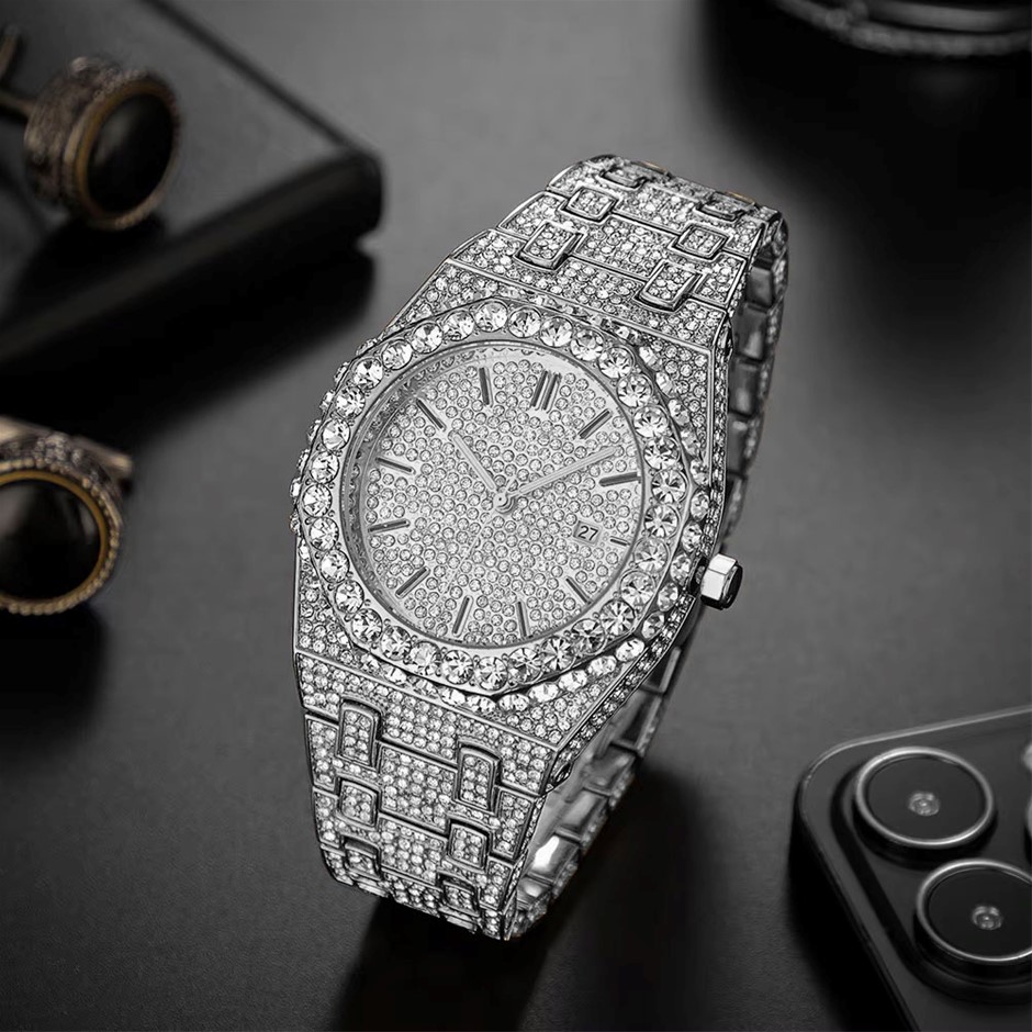 Luxury 18K White Gold Plated Full Diamond Quartz Iced Out Wrist Watch