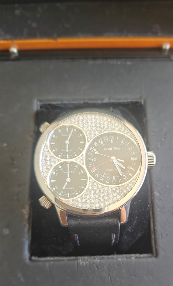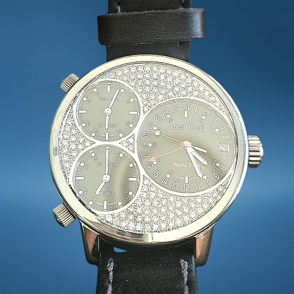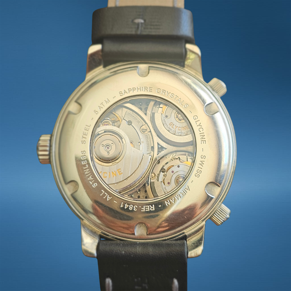 GLYCINE AIRMAN 3841 MULTI TIME 53MM CUSTOM 18K WHITE GOLD NATURAL DIAMOND SET DIAL UNKNOWN AUTOMATIC BLACK MULTI DIAL WXO & COA