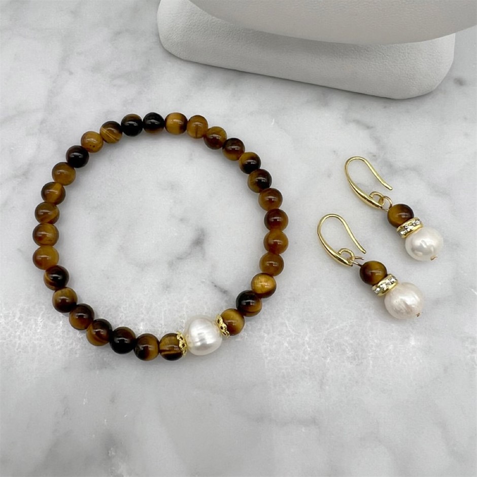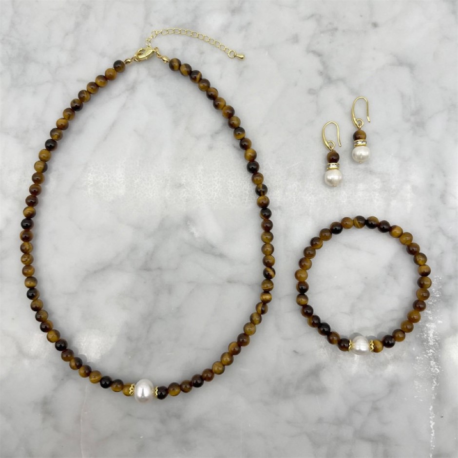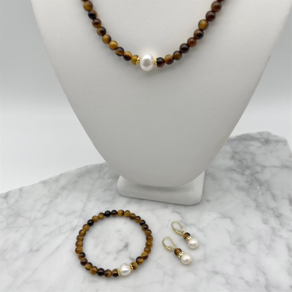 Natural White Freshwater Pearls with Tiger Eye Gemstone Necklace, Bracelet & Earring Jewellery Set