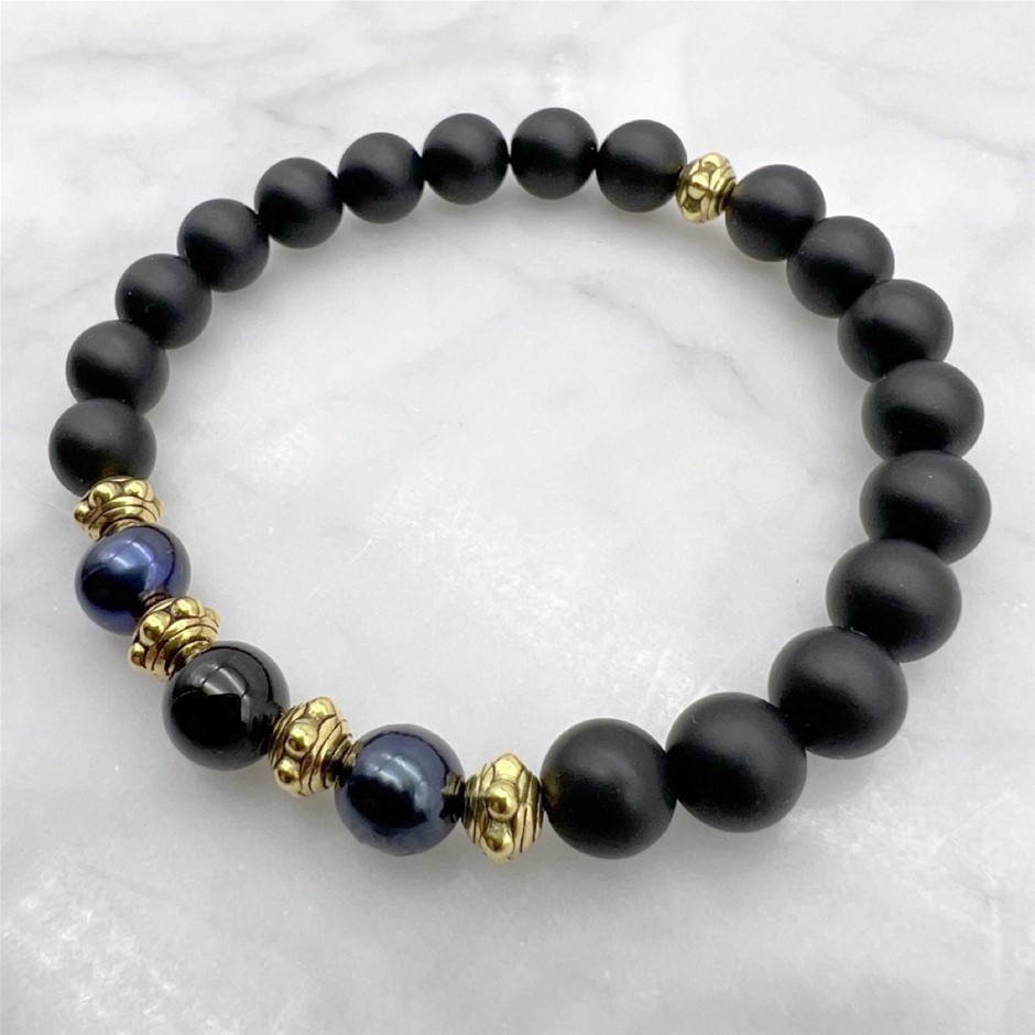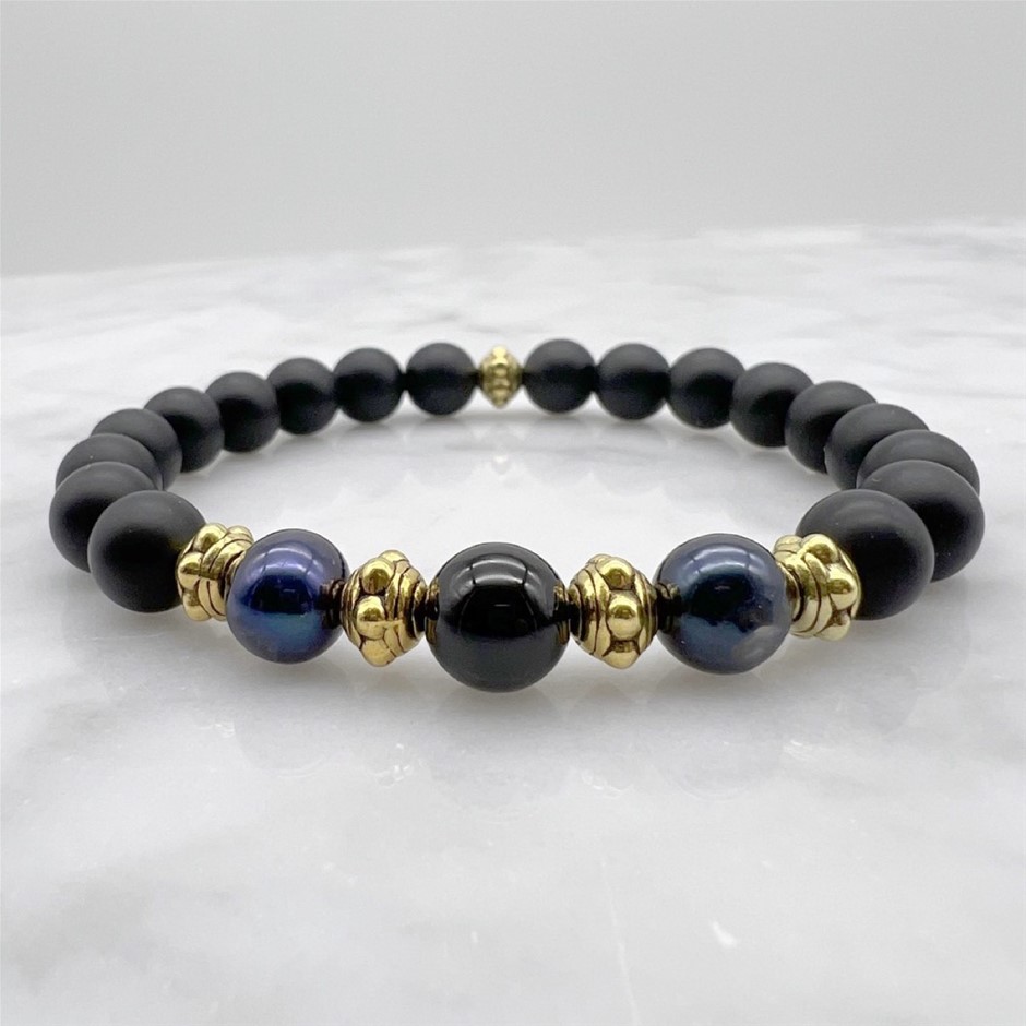 8mm Frosted Agate, Black Agate, Freshwater Pearls & Antique Gold Spacers Beaded Bracelet.Product Specifications: