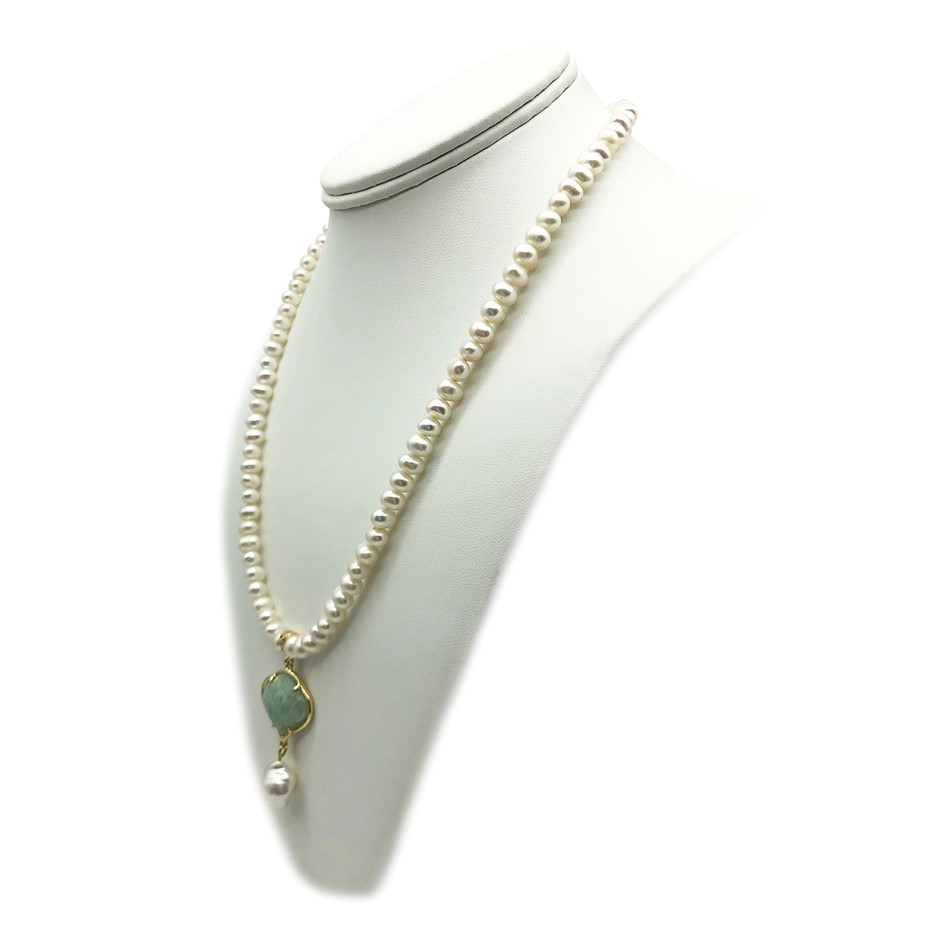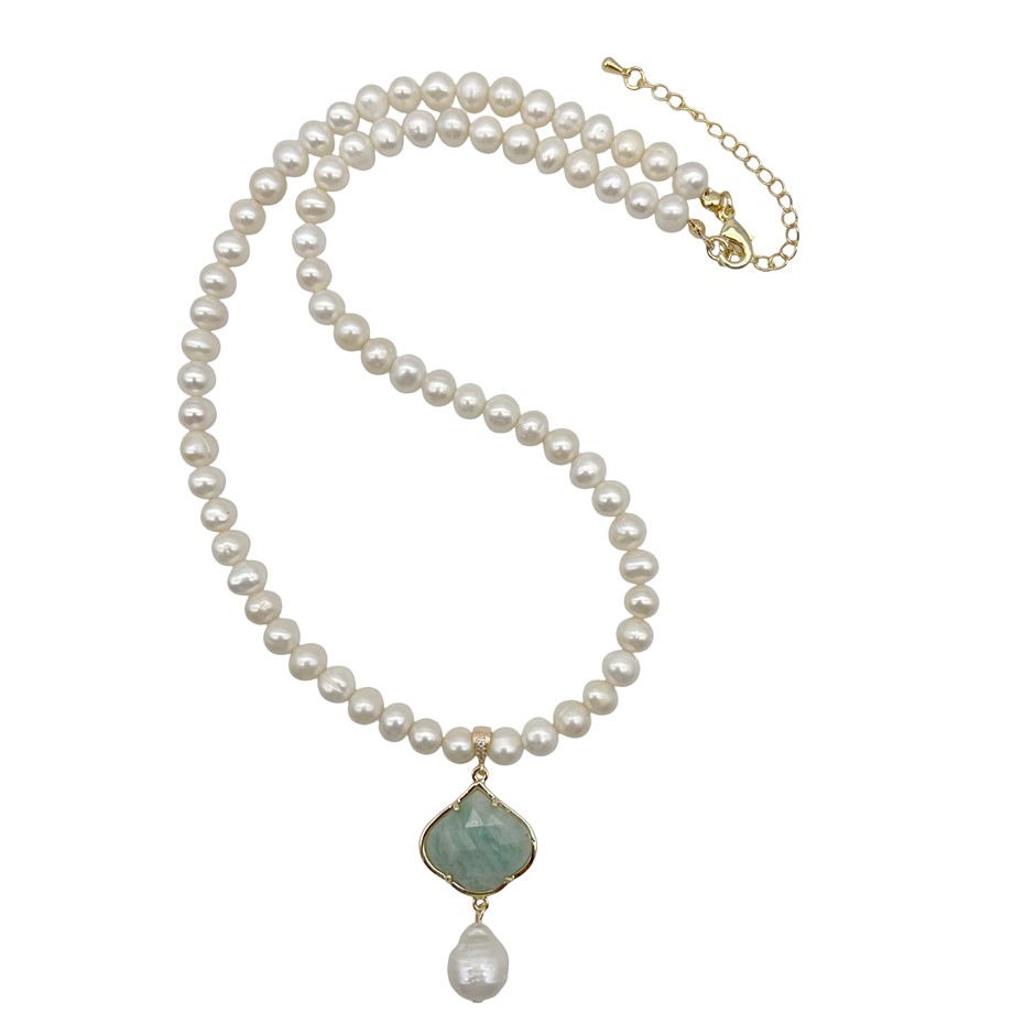 6-7mm White Freshwater & Baroque Pearl with Amazonite Pendant Charm Necklace.
