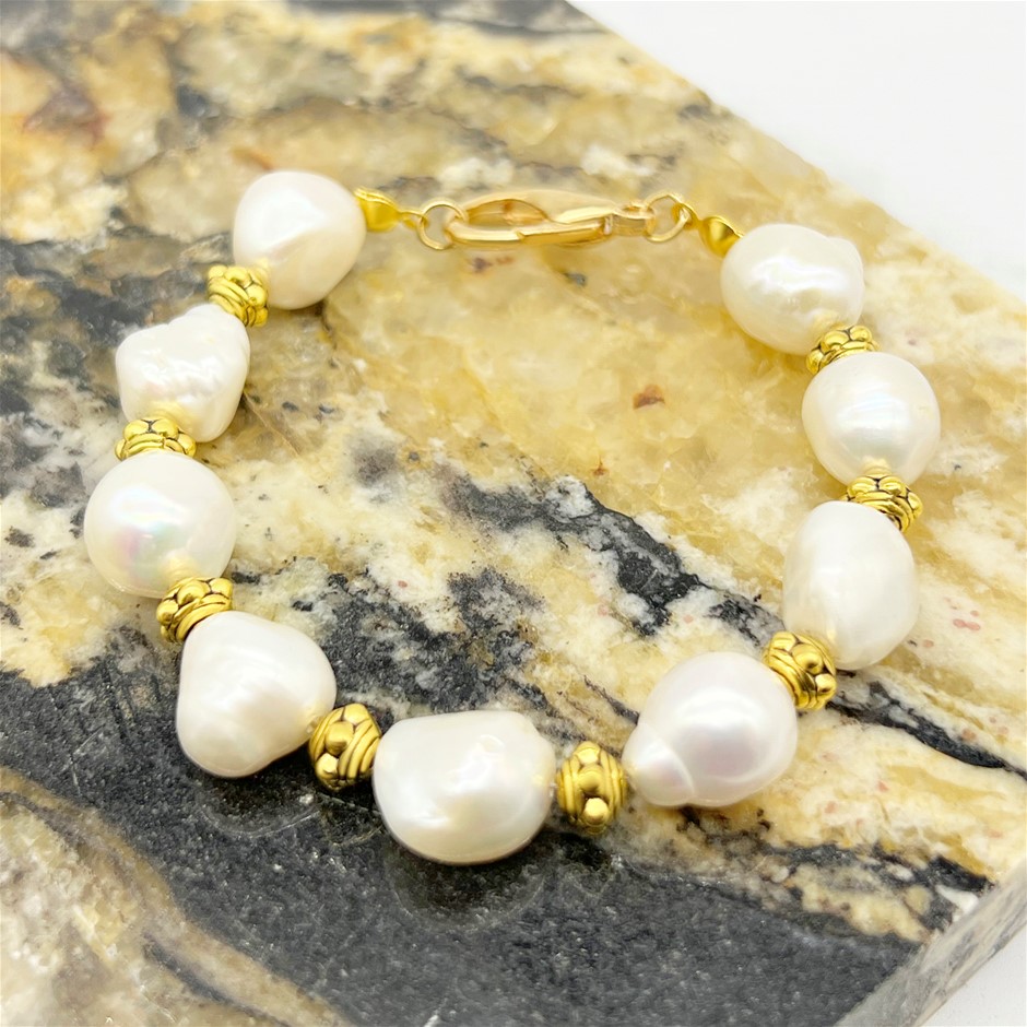 Baroque Freshwater Pearls & Large Lobster Clasp Gold Plated Bracelet.