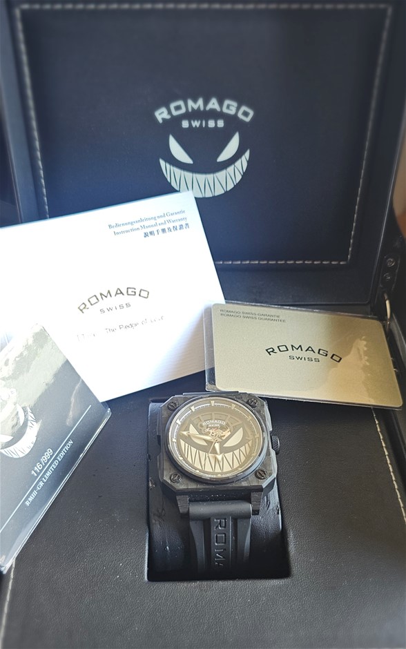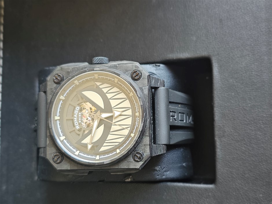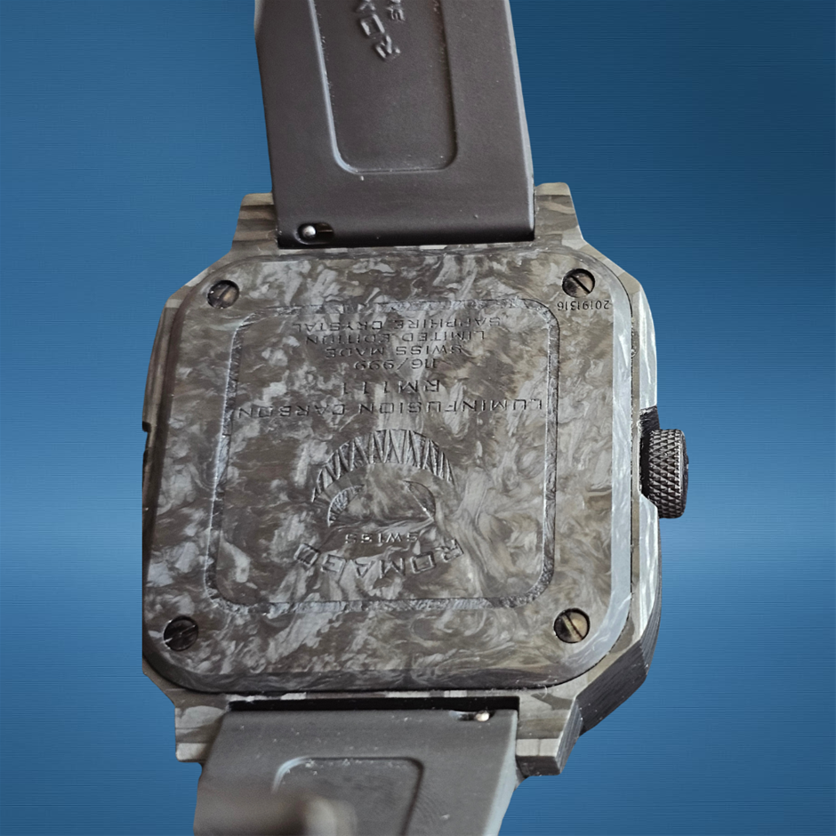 ROMAGO LUMINFUSION CARBON 46.5MM CARBON RM111 AUTOMATIC SKELETON DIAL BXP & COA