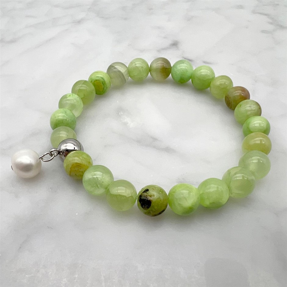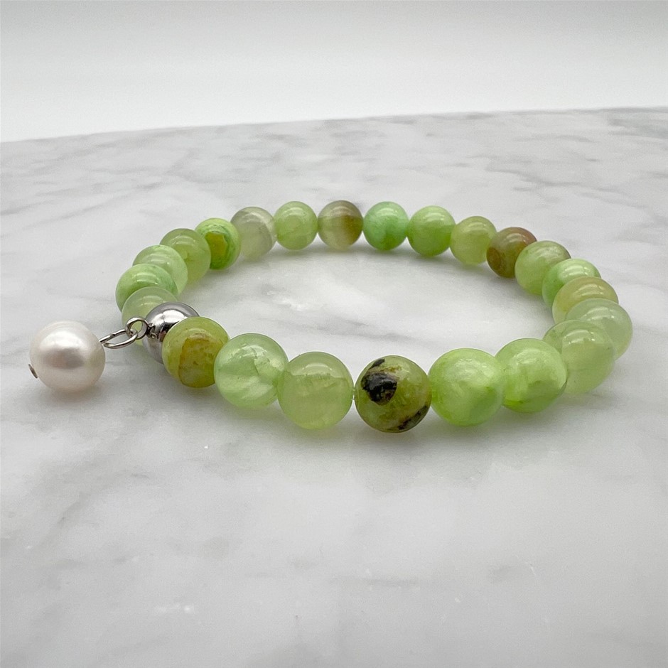 Large Freshwater Pearl and Flower Jade Gemstone Beaded Bracelet.